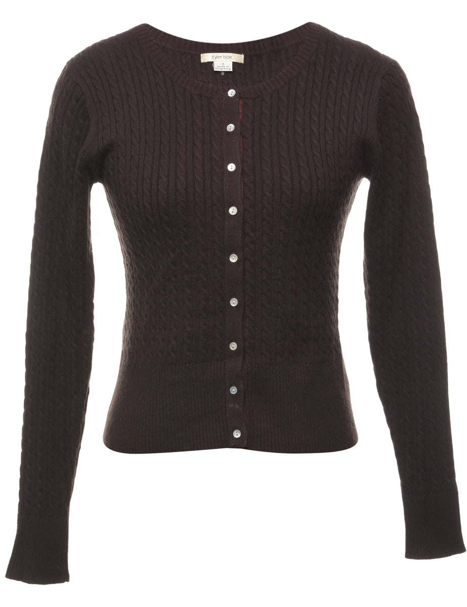 Button front cardigan in dark brown with a round neck.