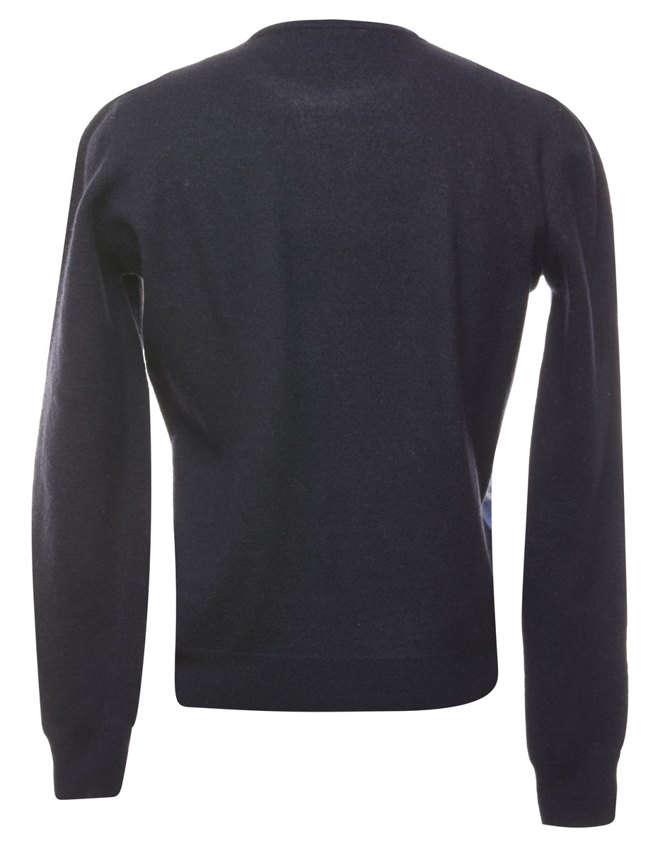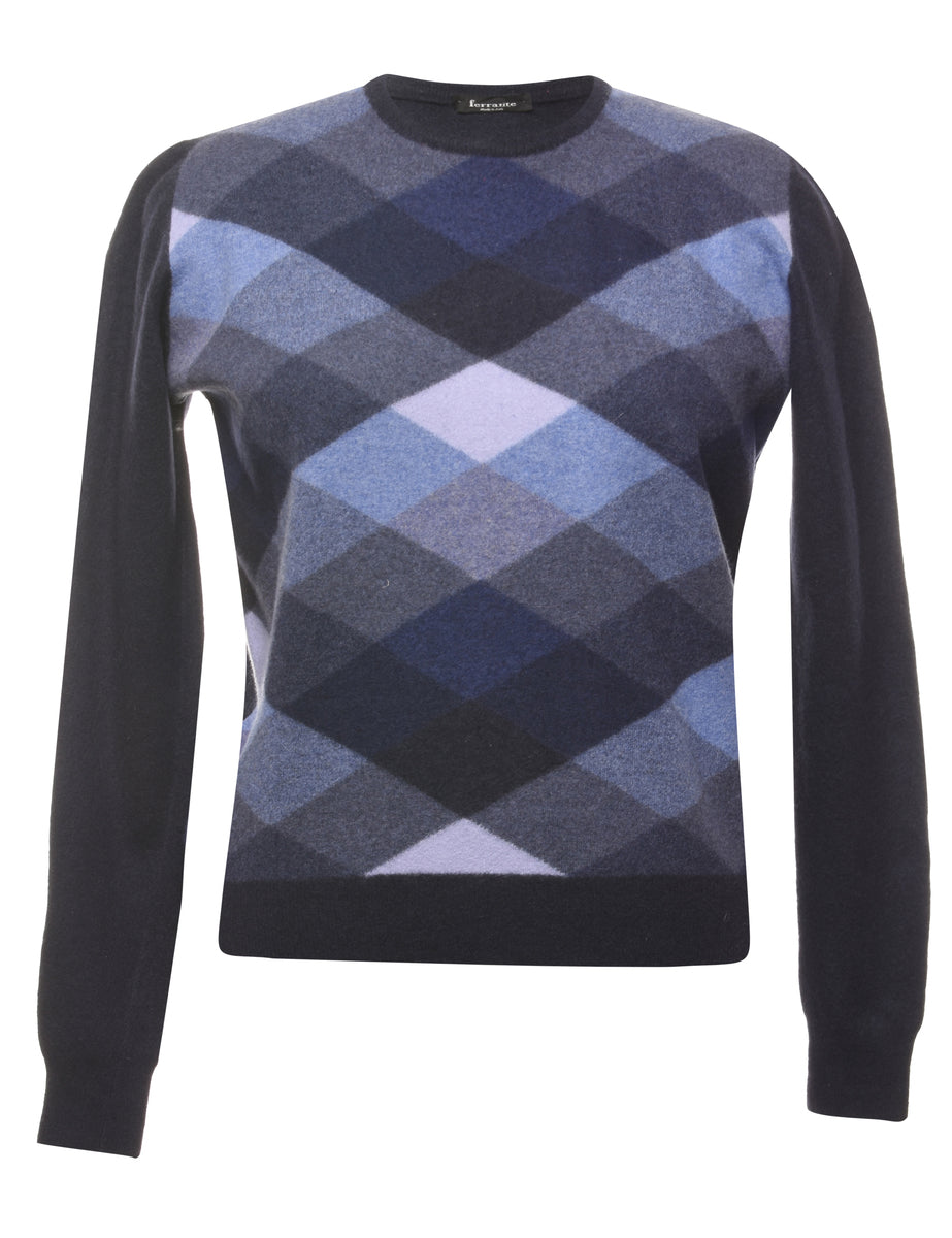 Argyle jumper in navy with a round neck.