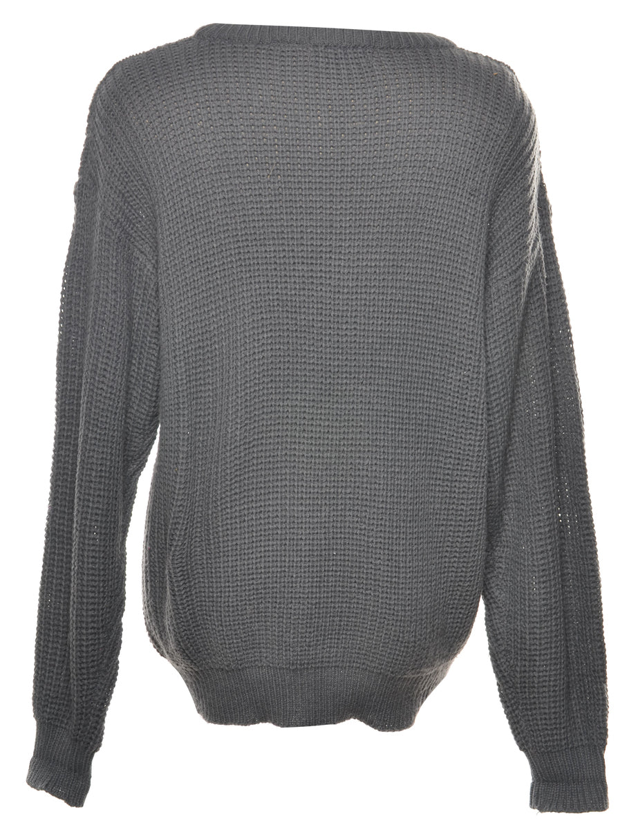 Cable knit jumper. Comes in dark grey with a crew neck.