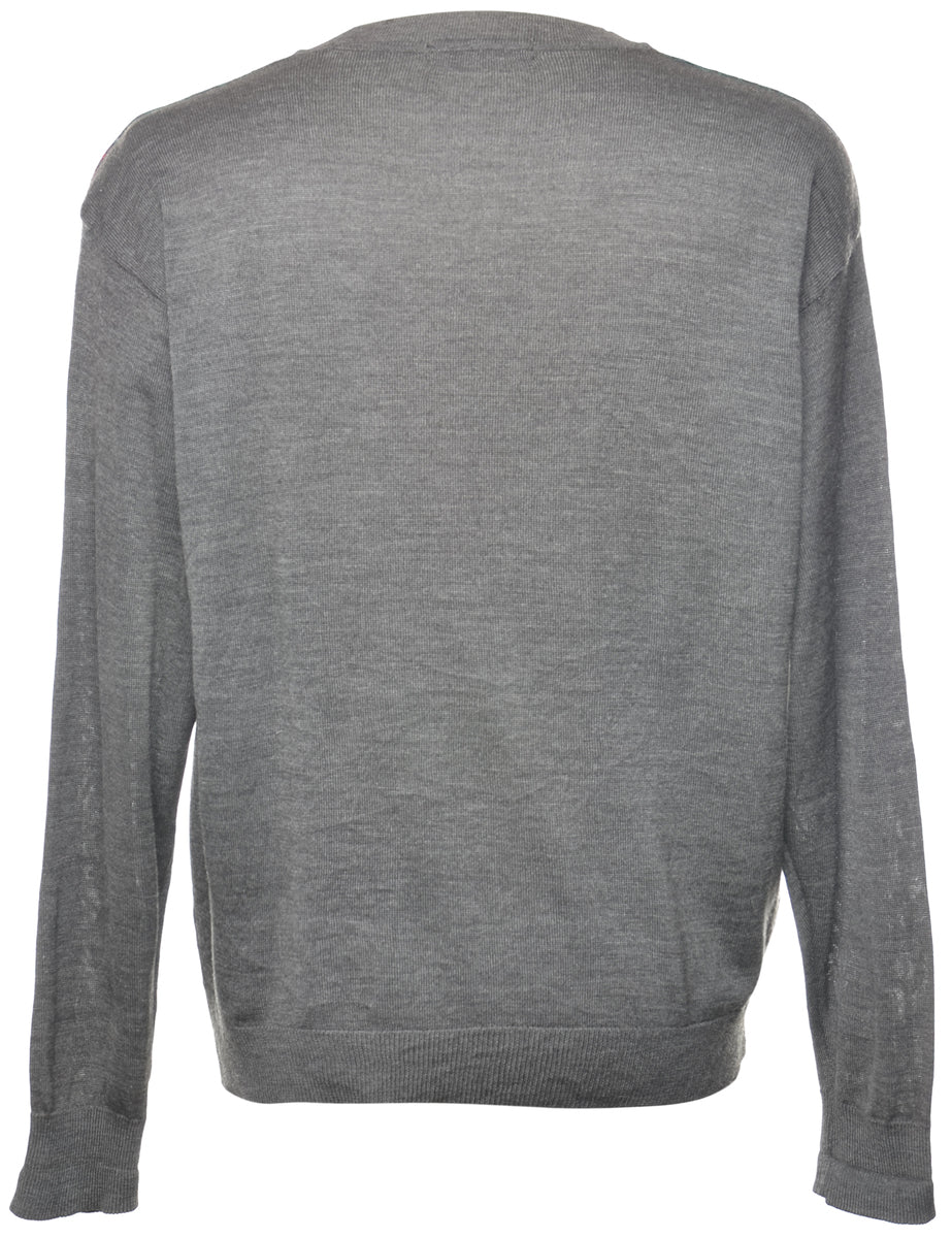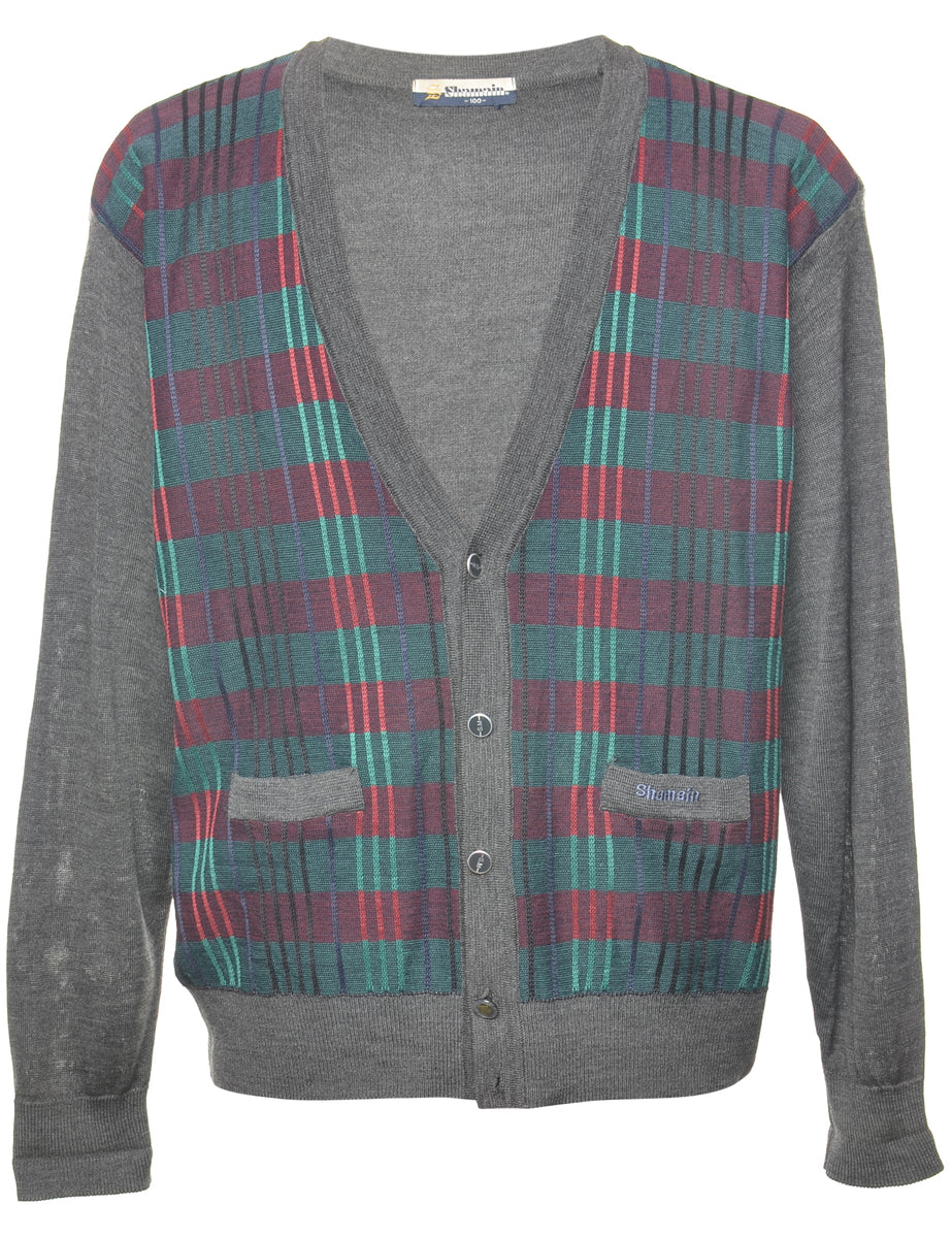 Checked cardigan comes in dark grey with a v-neck and two pockets.