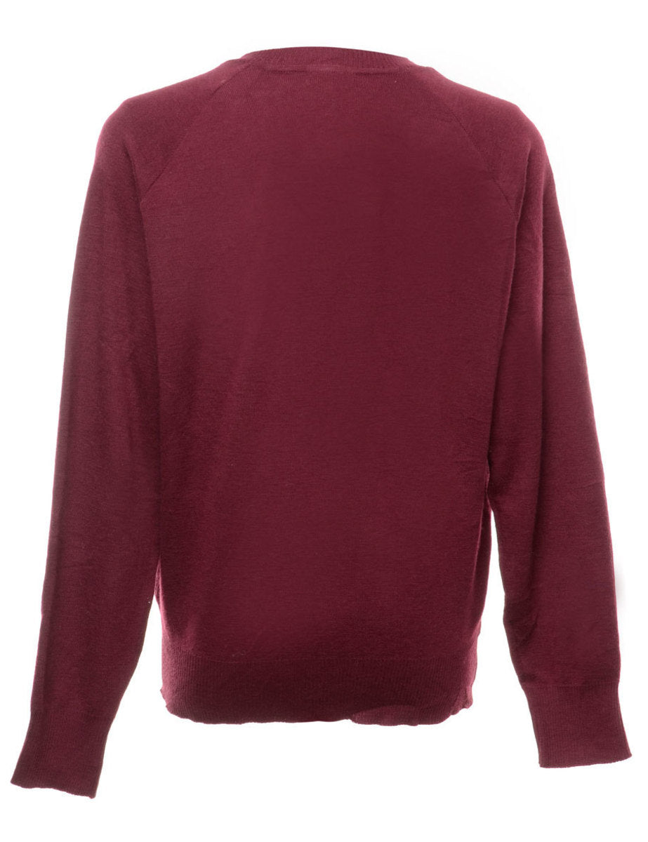 Fine knit jumper. Comes in burgundy with a v-neck and raglan sleeves.