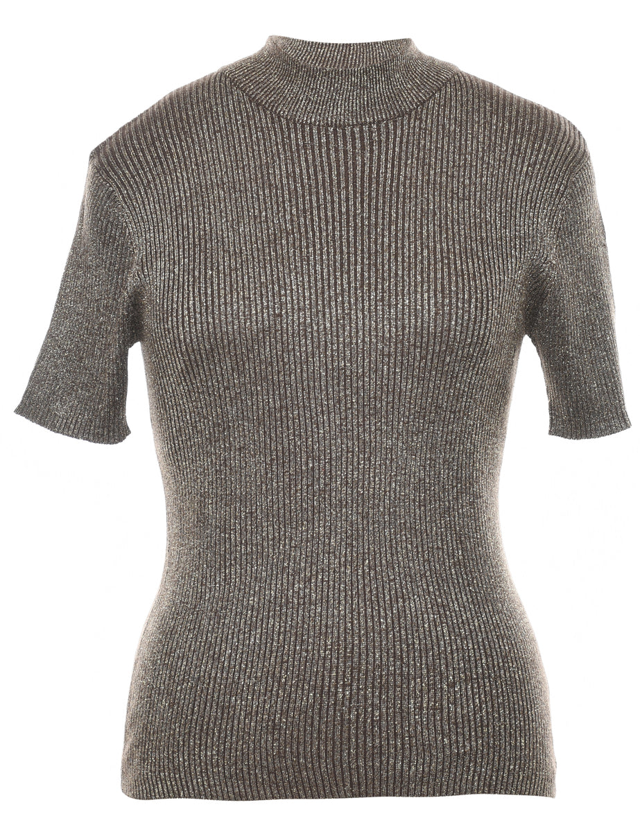 High neck jumper. Comes in olive green with lurex thread pattern. The size label mentions L but based on the actual measurements we consider it a size S.