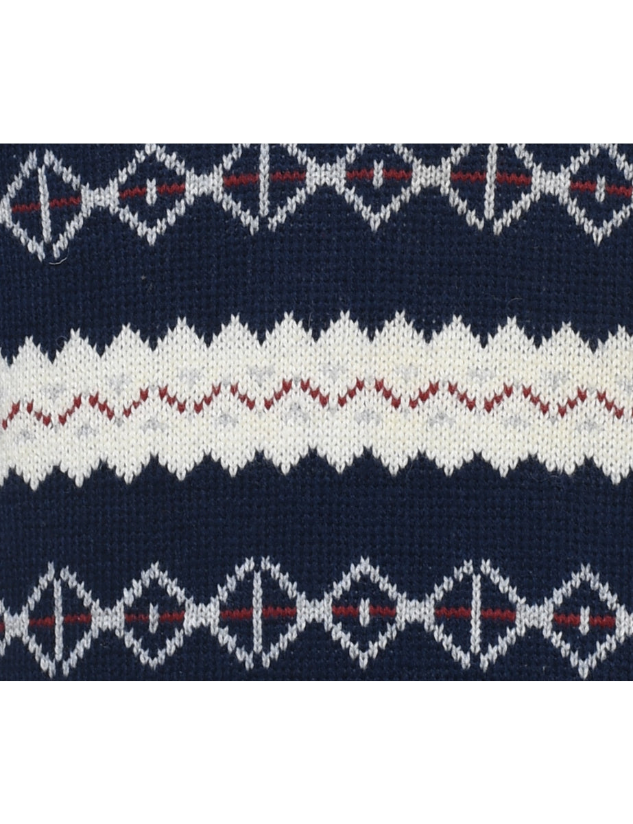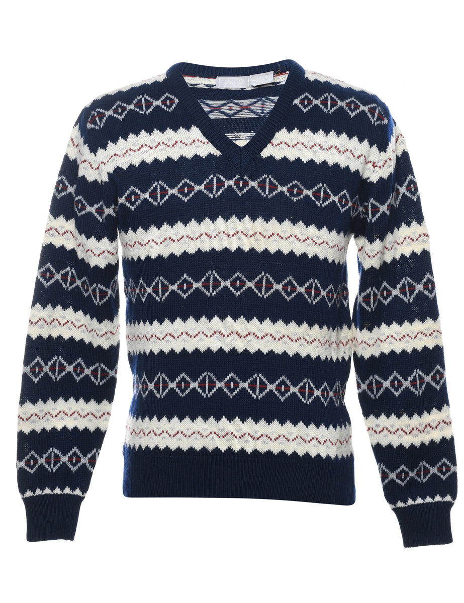 Patterned jumper. Comes in navy & off white with a v-neck.