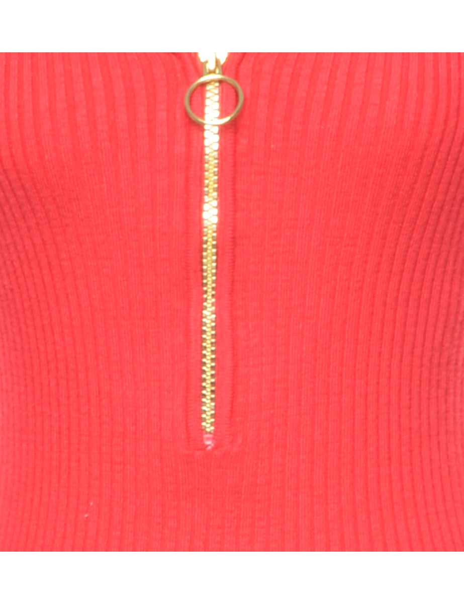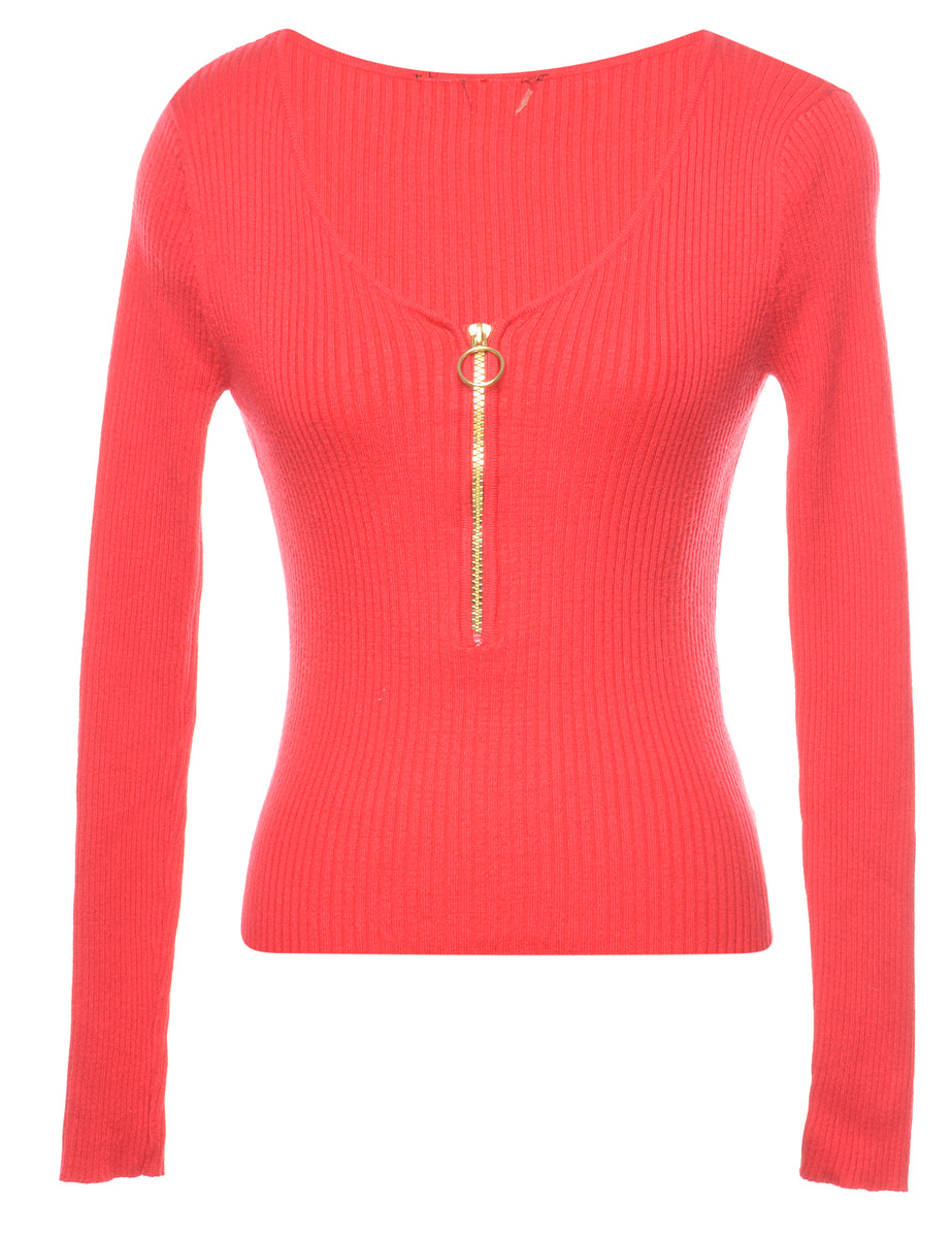 Quarter zip fine knit jumper. Comes in red with a v-neck.