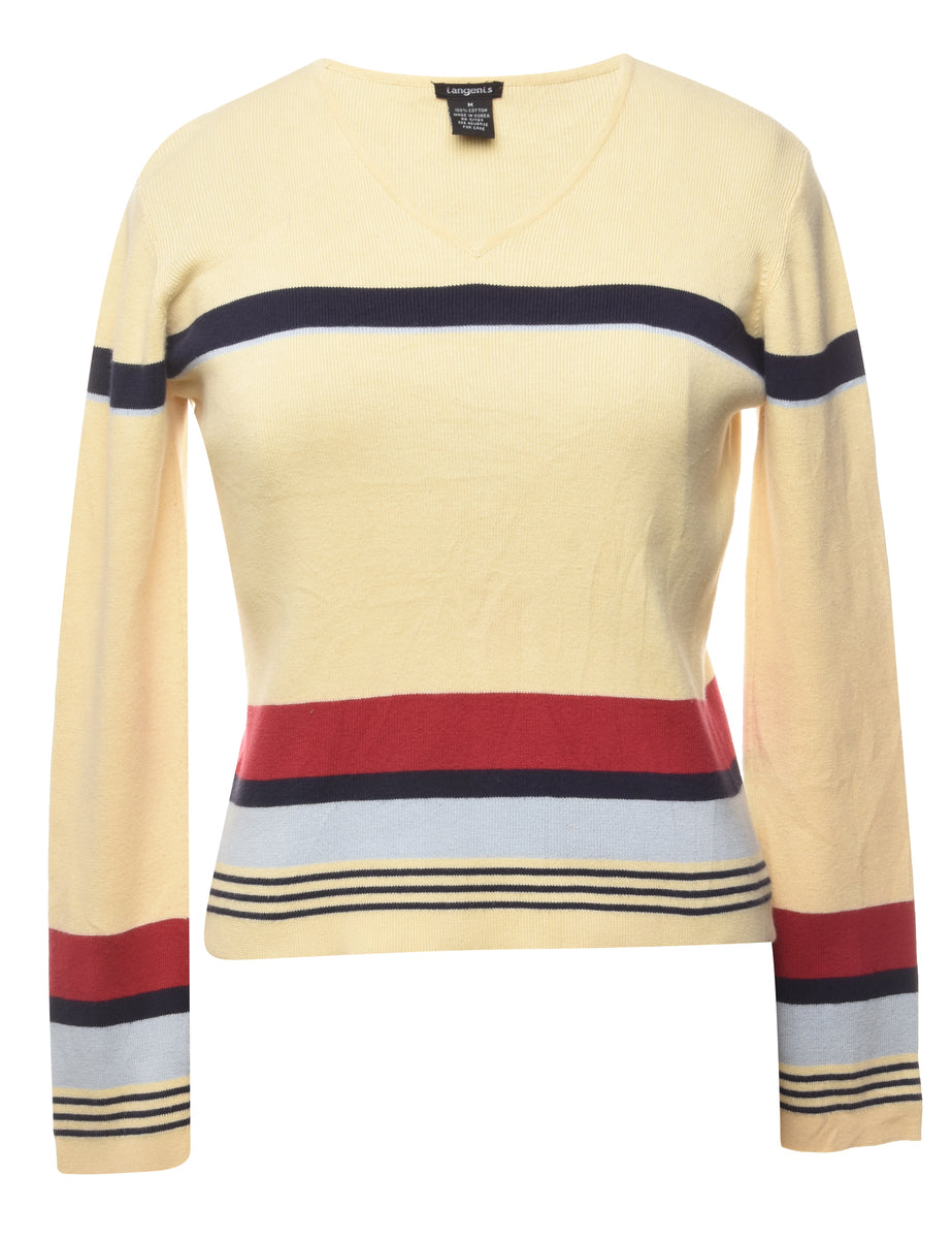 Striped pale yellow jumper with a v-neck.