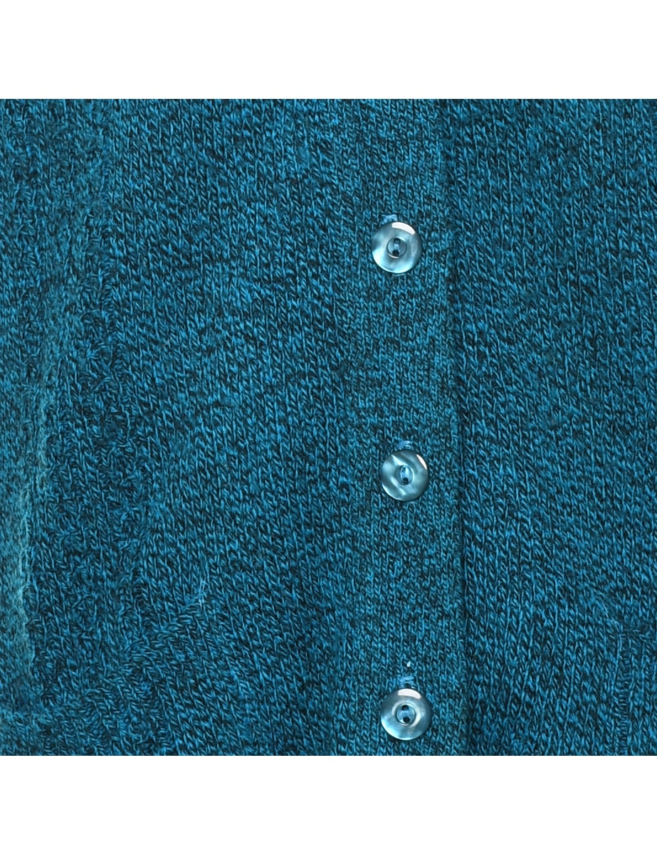 Button through sweater vest. Comes in teal.