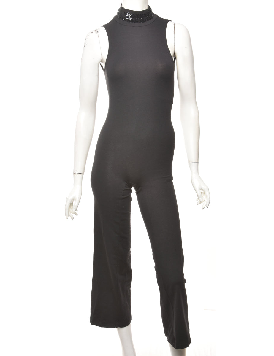 High neck jumpsuit in black with a cut-out back and sequins.