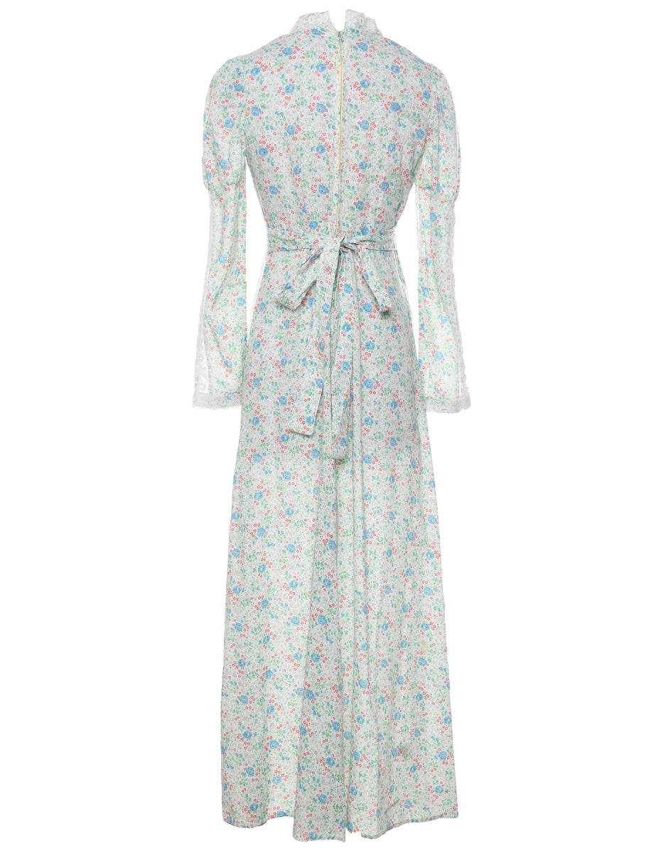 Floral print multi-colour 1970s maxi dress with a high neck and lace trim.