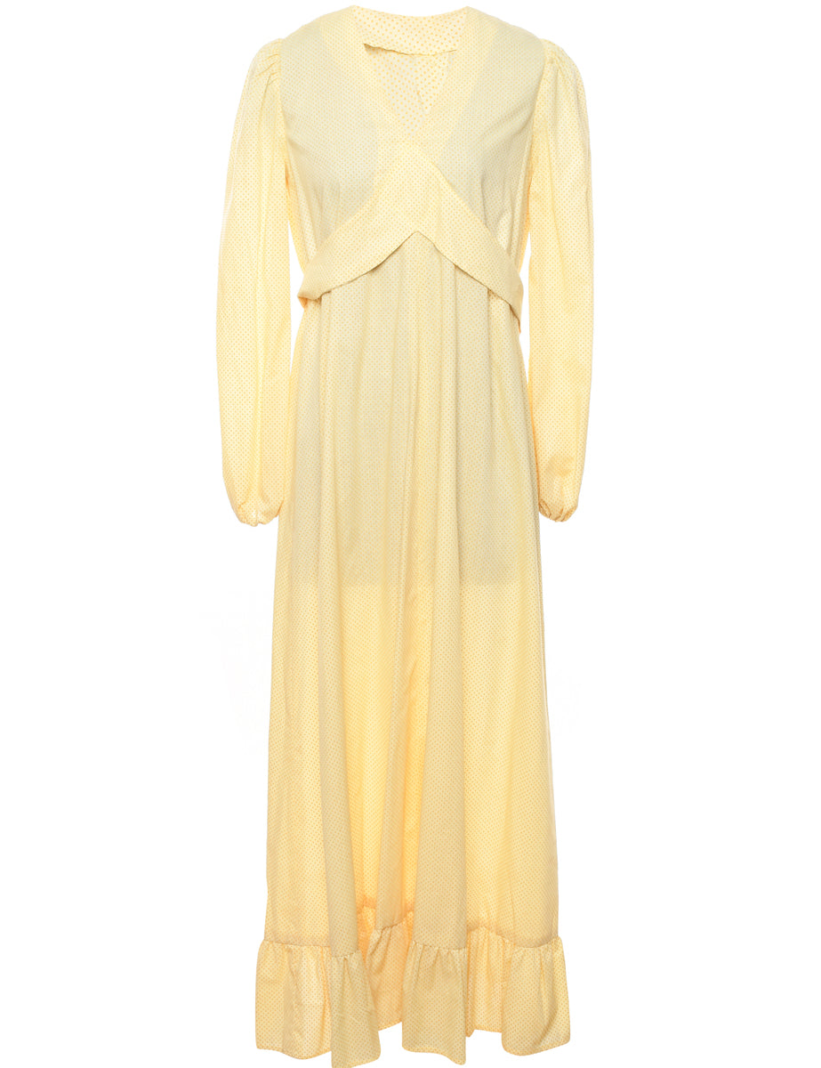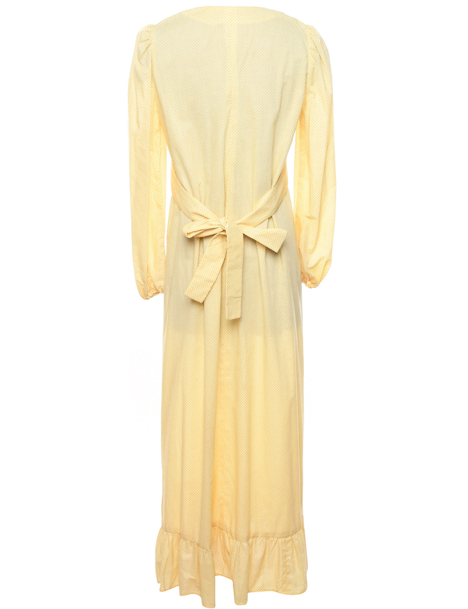 Long sleeved dress from the 1970s in yellow with back tie and v neck.
