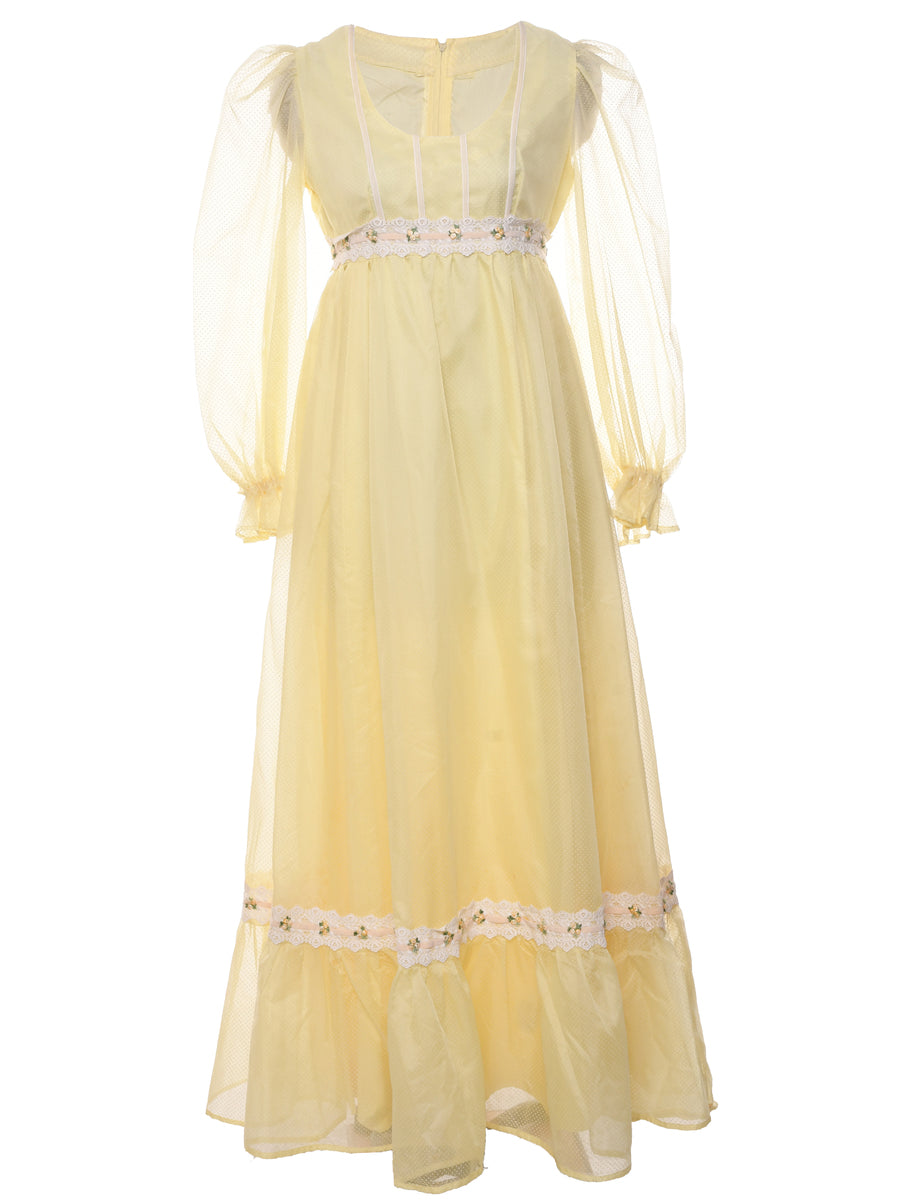 1970s Pale Yellow Prairie Style Maxi Dress - S
