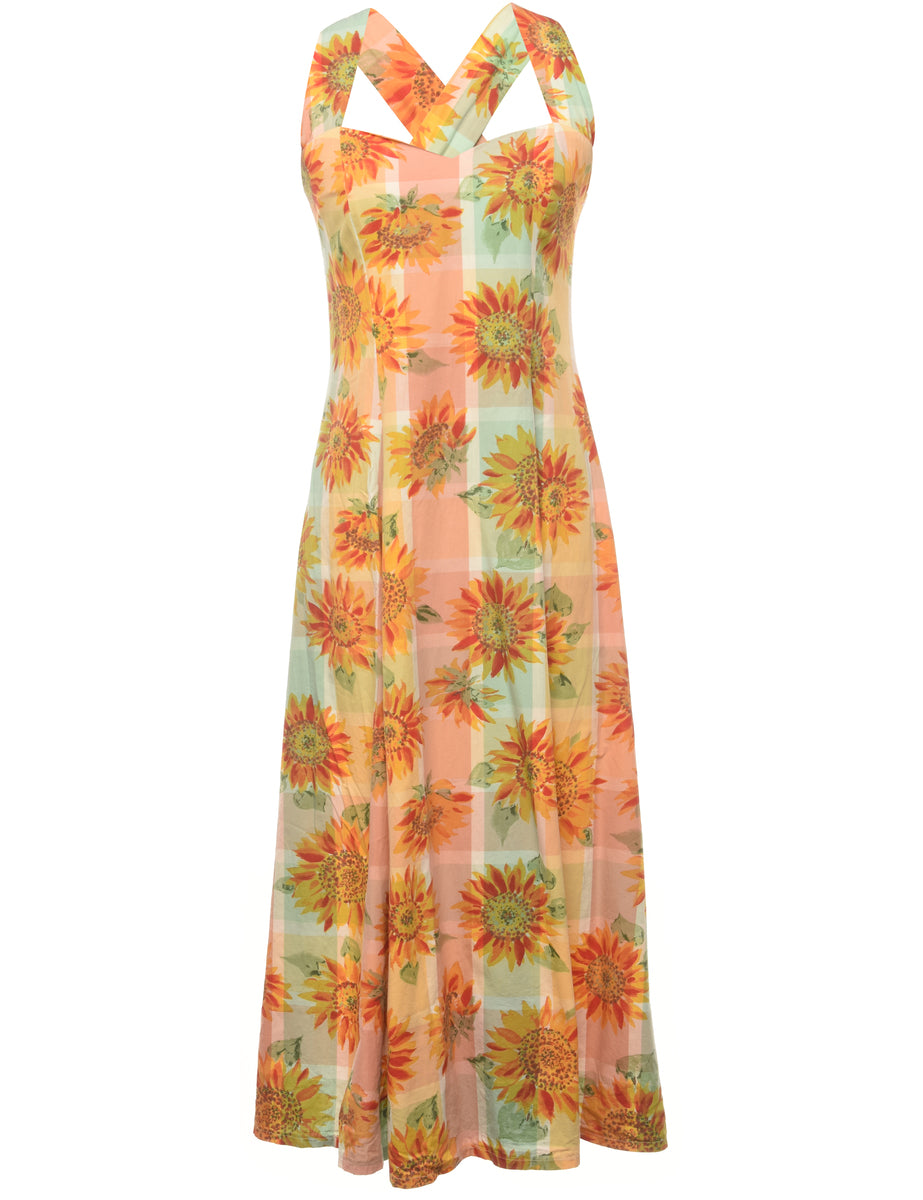 Floral pattern multi-colour dress with a criss cross back and a sweetheart neckline.
