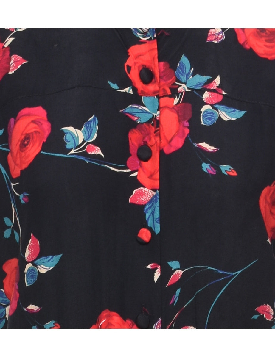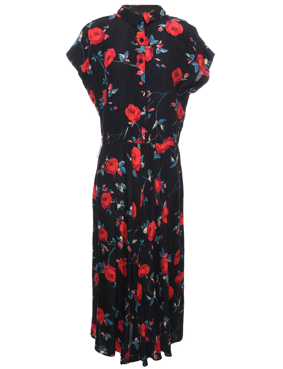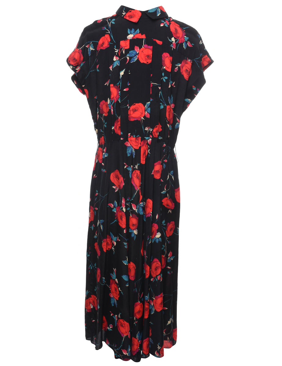Floral print dress comes in black with a peter pan collar and removable shoulder pads.