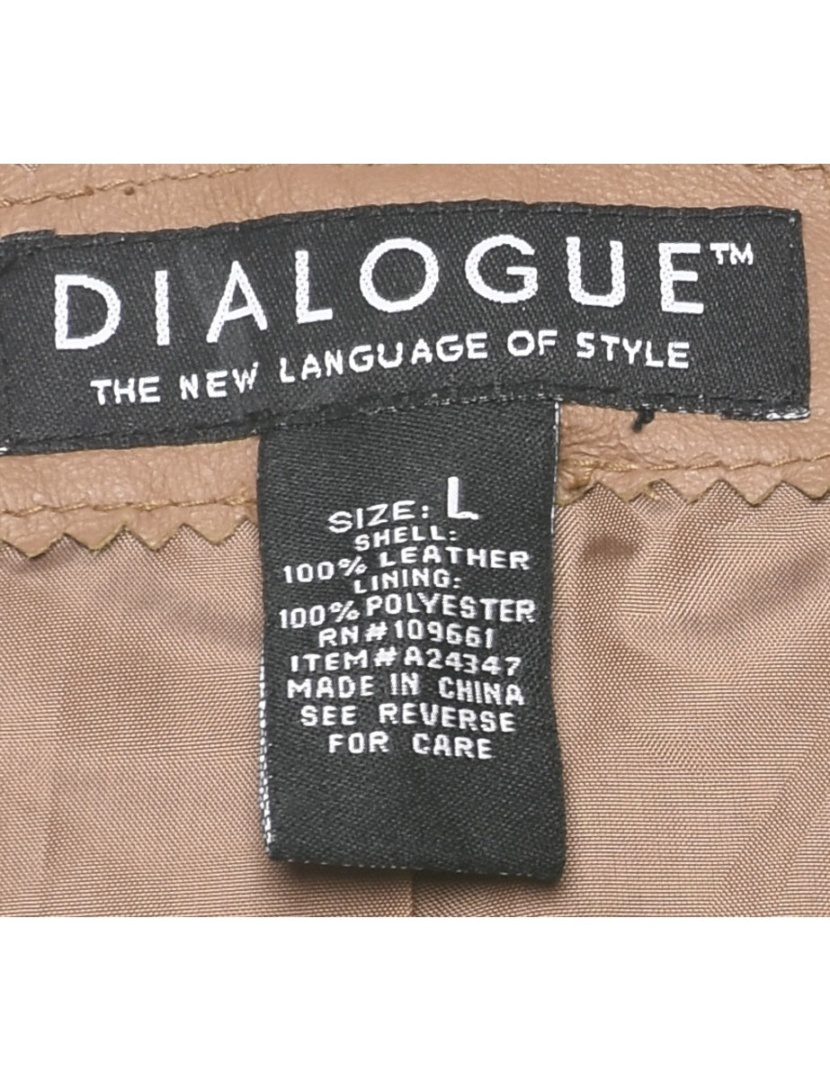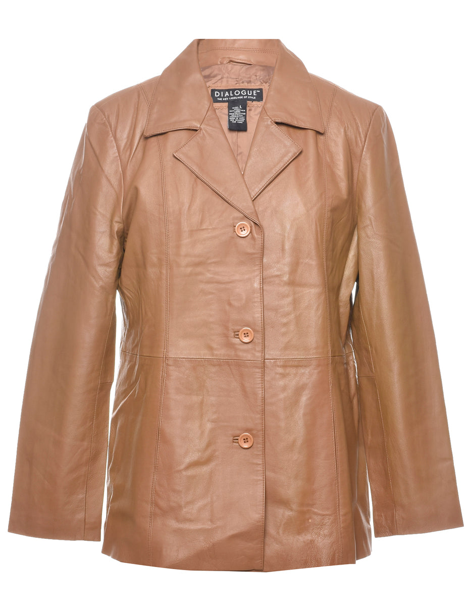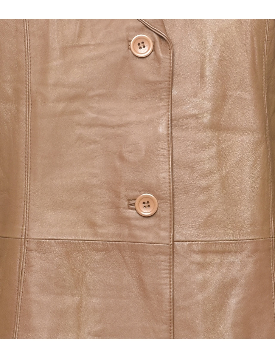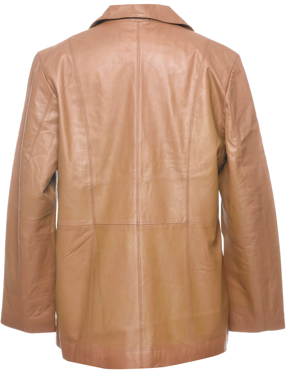 Single-breasted tan leather jacket complete with multiple pockets and shoulder pads.