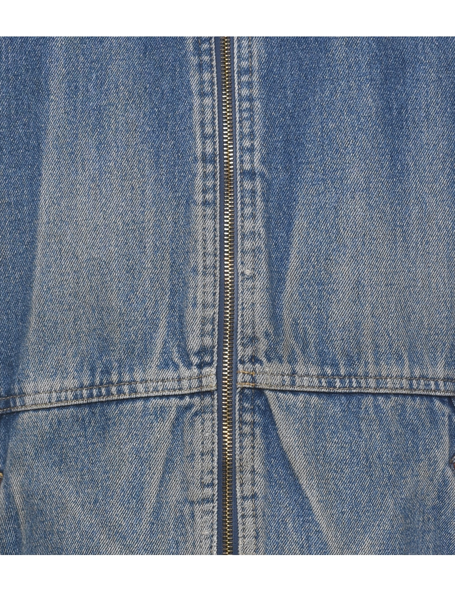 Zip front shearling denim vest in medium wash with multiple pockets. From the brand Wrangler.