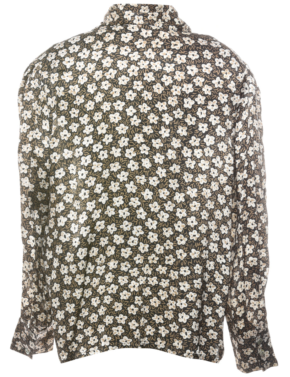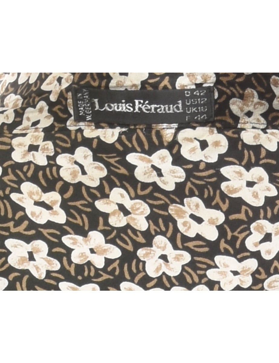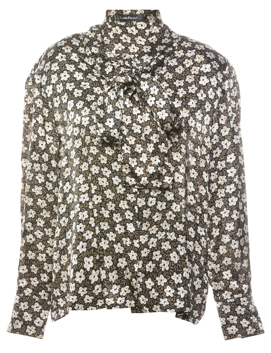 Floral blouse in black & light brown with tie detail and removable shoulder pads.