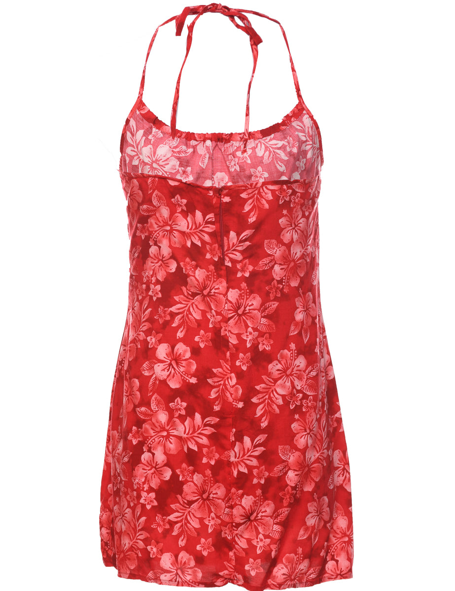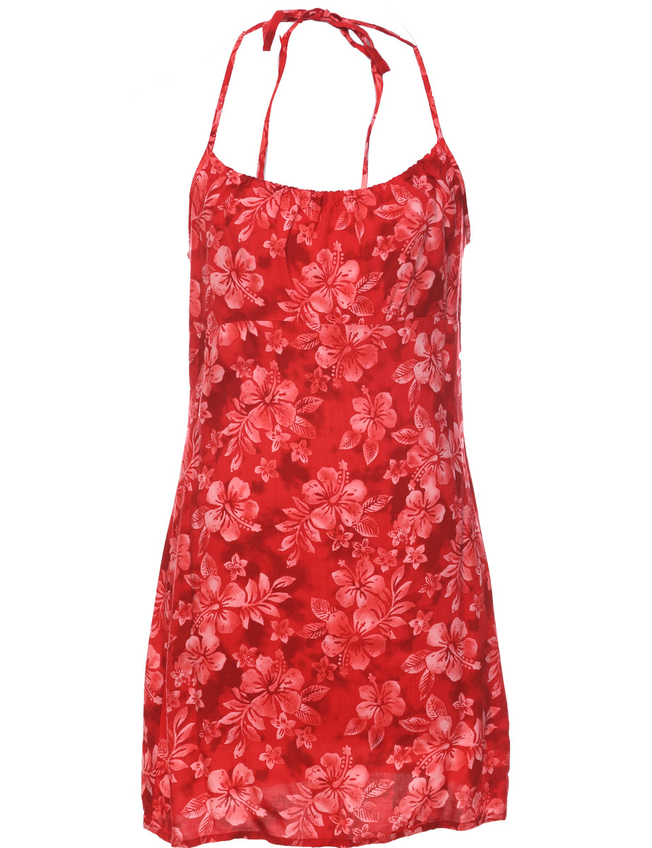 Floral print dress comes in red with a halterneck.