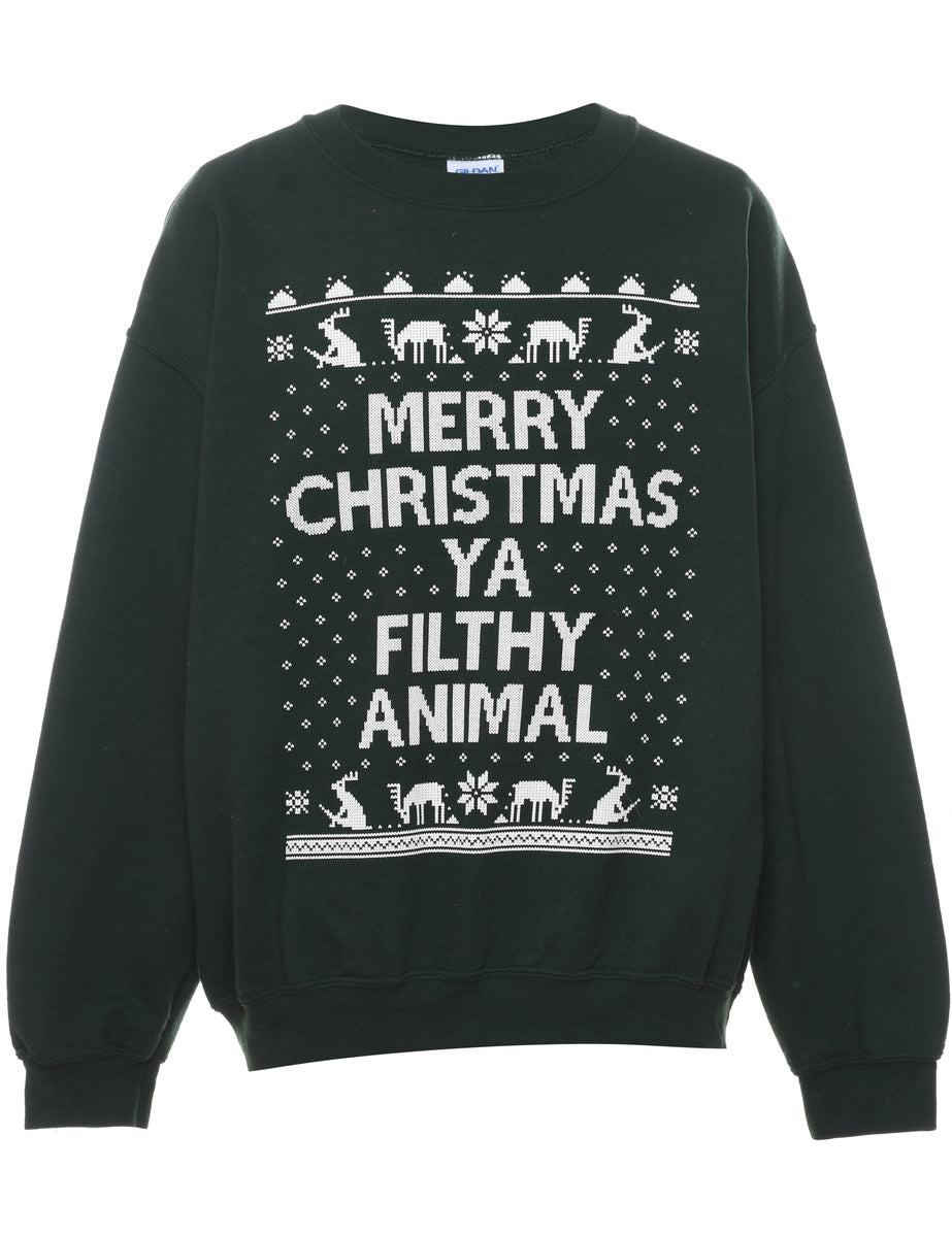 Dark green & white 'Merry Christmas Ya Filthy Animal' design printed sweatshirt.