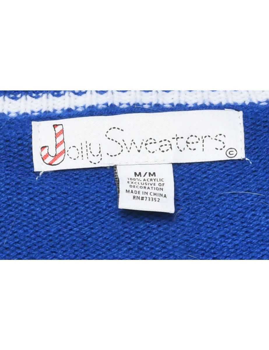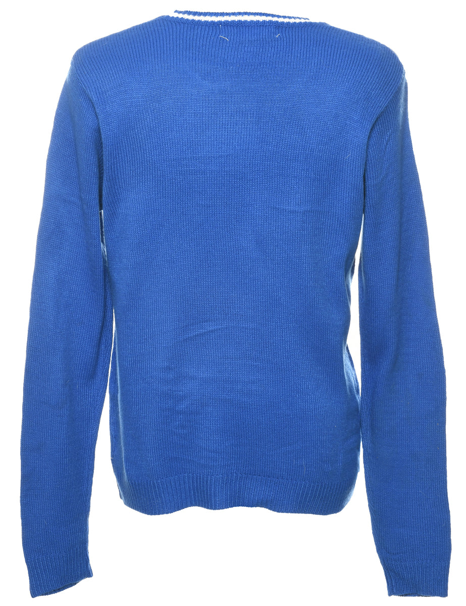 Reindeer christmas jumper in blue with embroidery and an applique design.