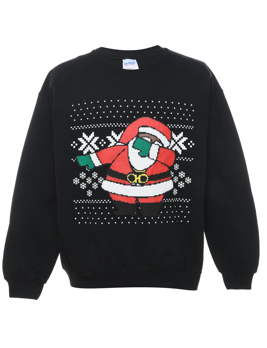 Santa claus christmas sweatshirt in black with a ribbed neck and cuffs.