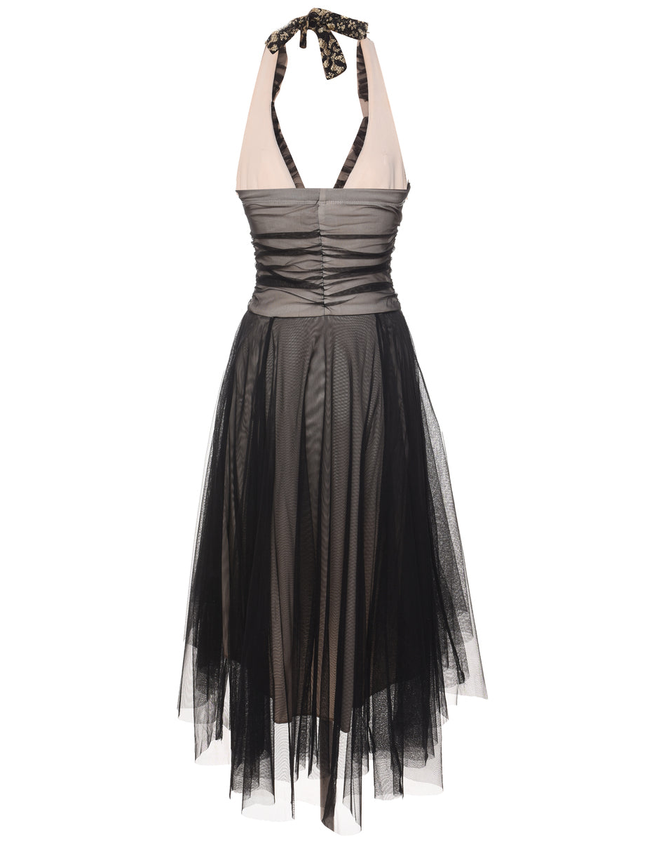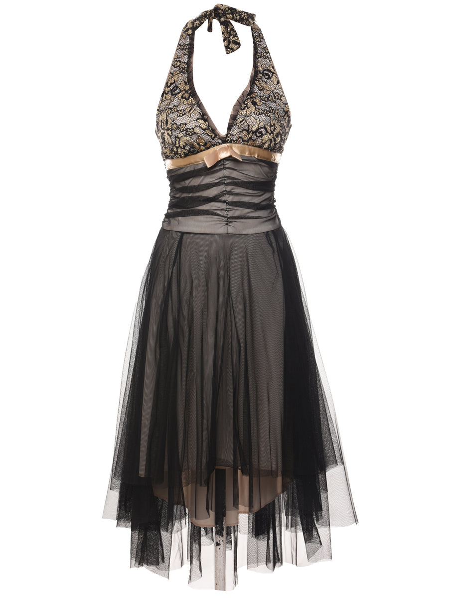 Vintage Black & Gold Lace Detail Halterneck Evening Dress - S