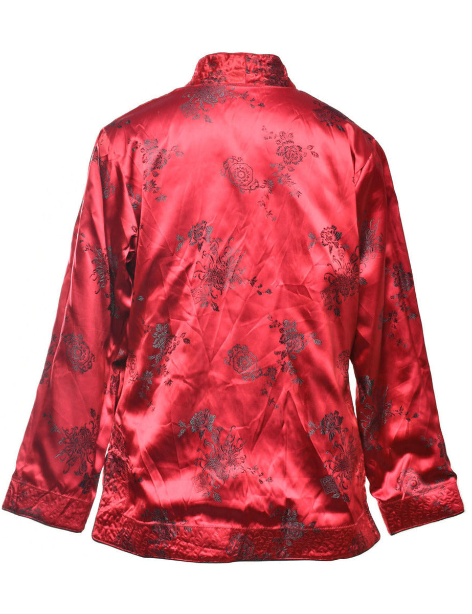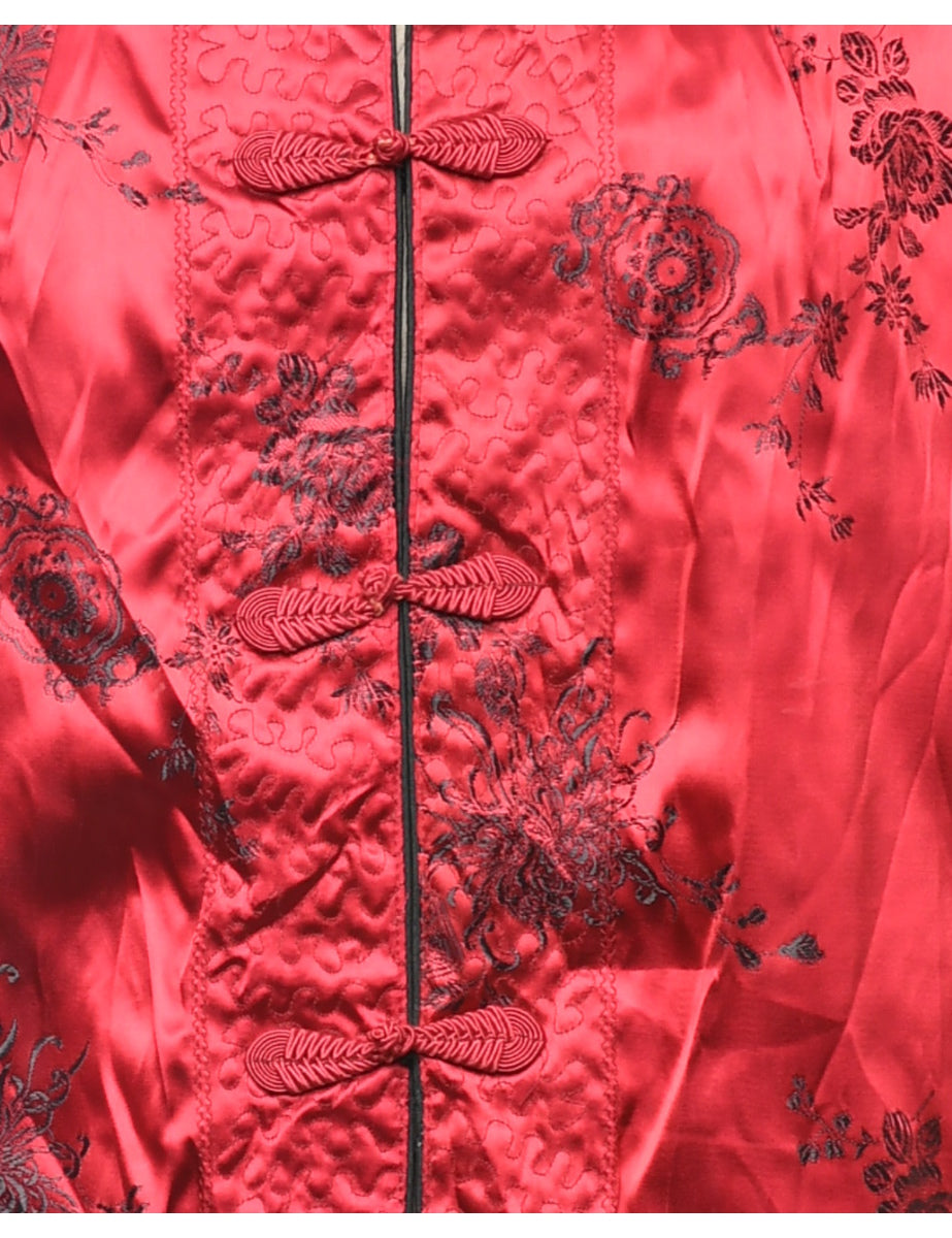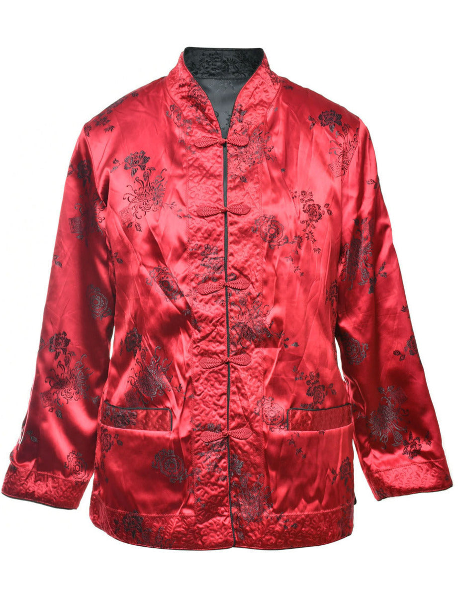 Brocade evening jacket with floral print. Comes in maroon with a grandad collar and full lining.