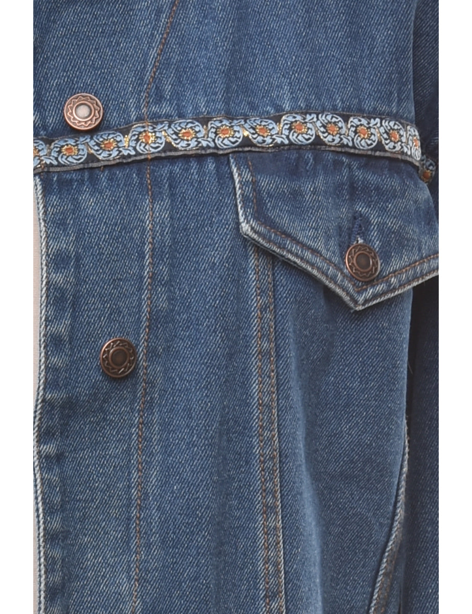 Button front denim jacket. Comes in indigo with multiple pockets and decorative trim.