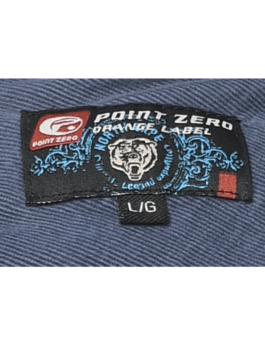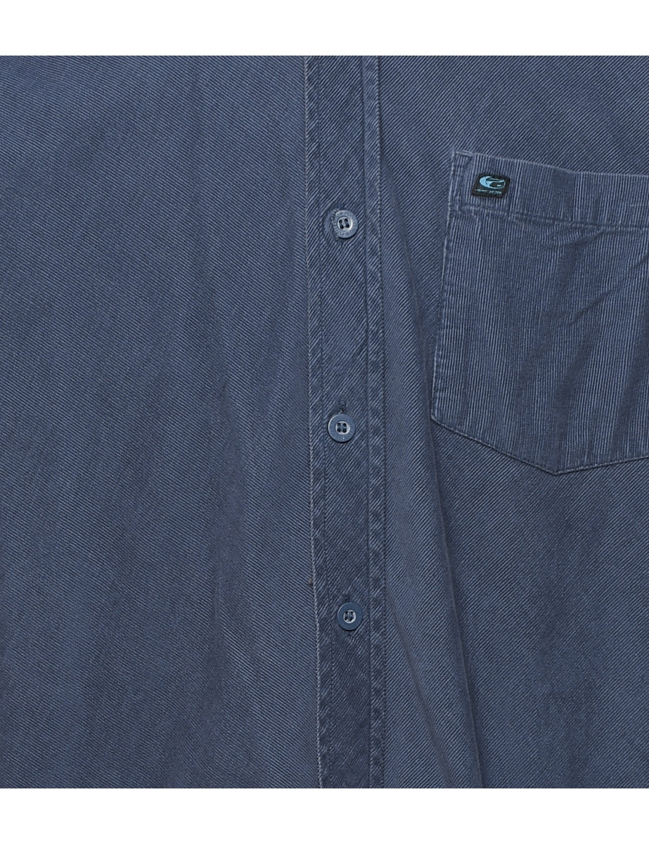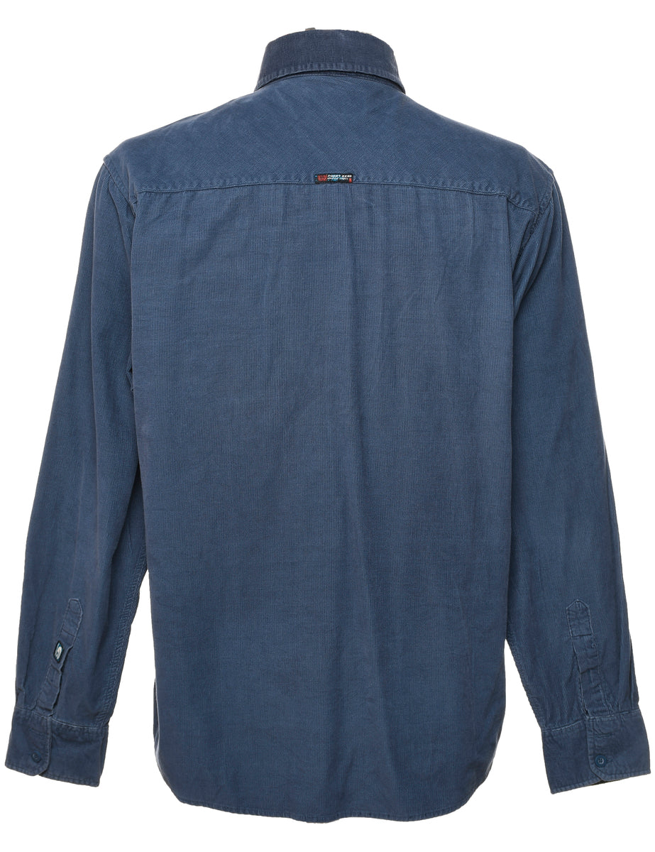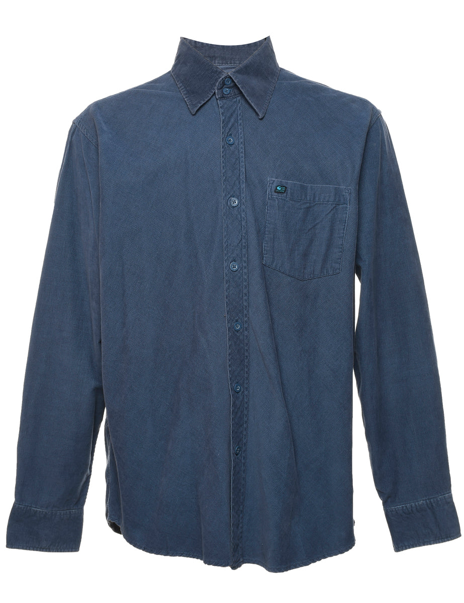 Corduroy shirt comes in blue with a classic collar and one pocket.