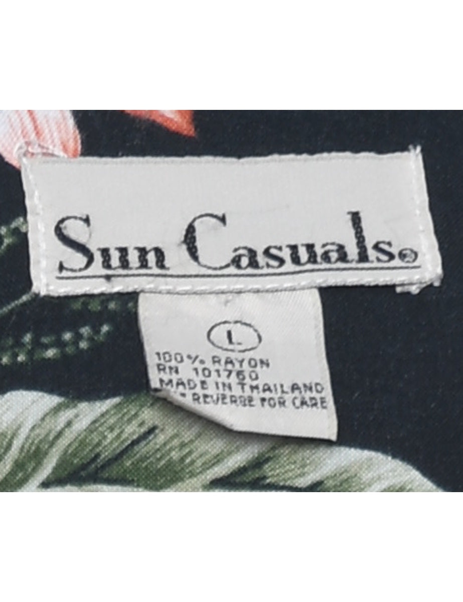 Floral hawaiian shirt comes in black with a revere front and one pocket.