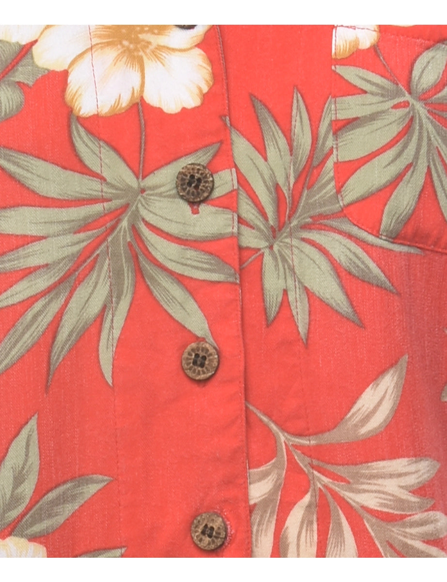 Foliage hawaiian shirt in red with a revere front and one pocket.