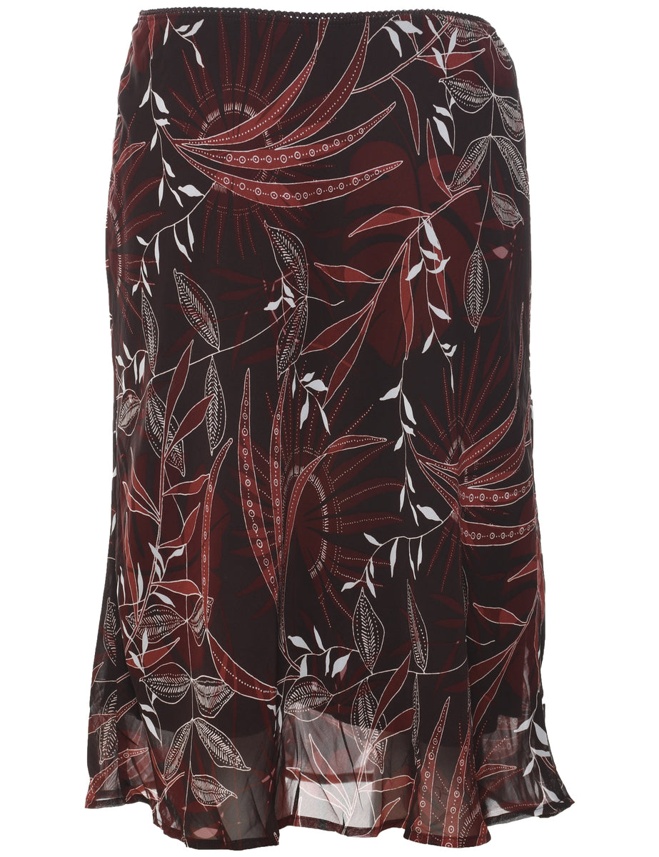 Leafy print a-line skirt comes in dark brown with an elasticized waist.