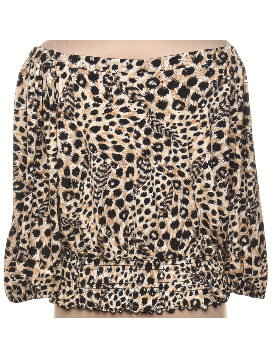 Leopard print light brown top with a boat neck and raglan sleeves.