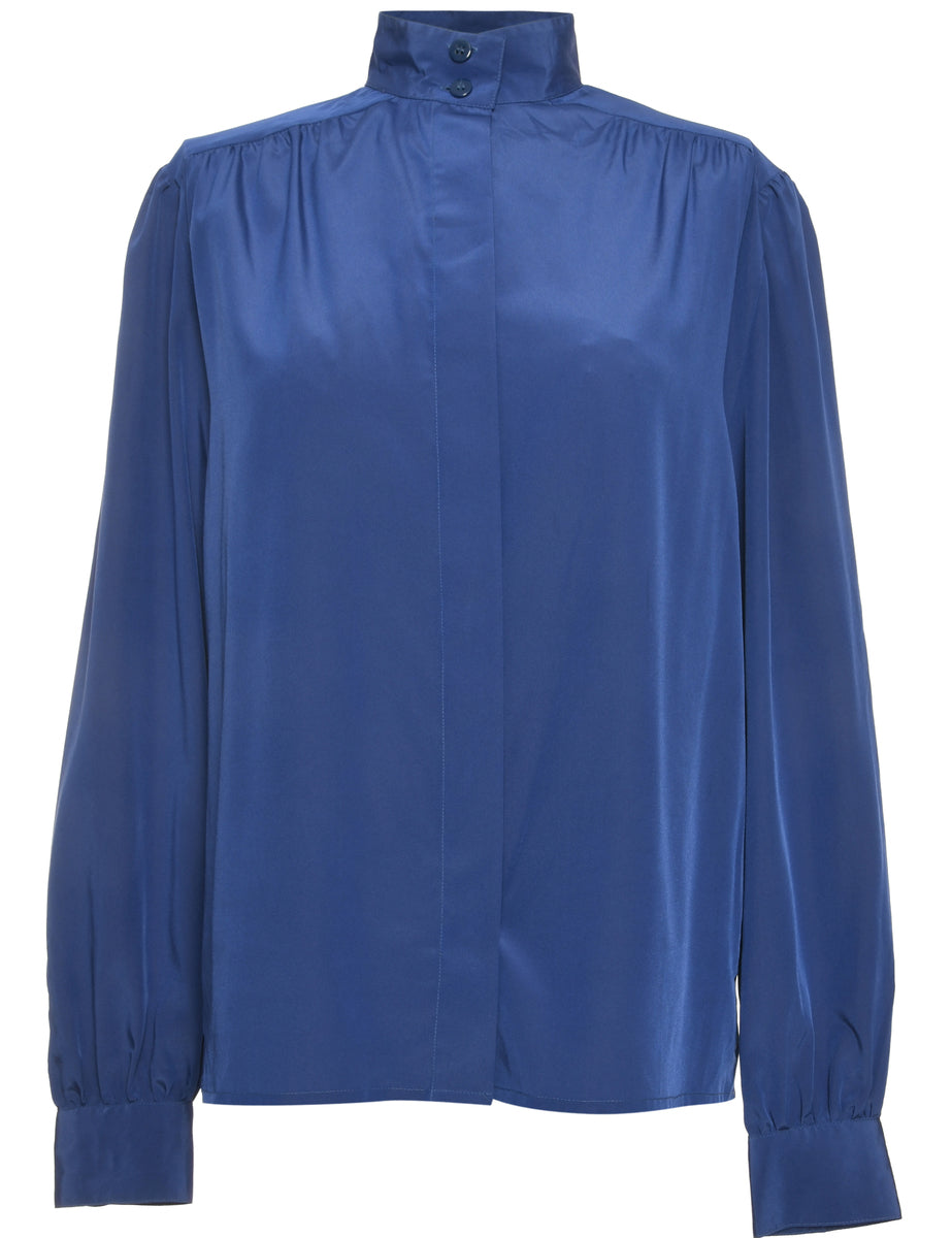 Long sleeved navy blouse with pleat detail and built in shoulder pads.