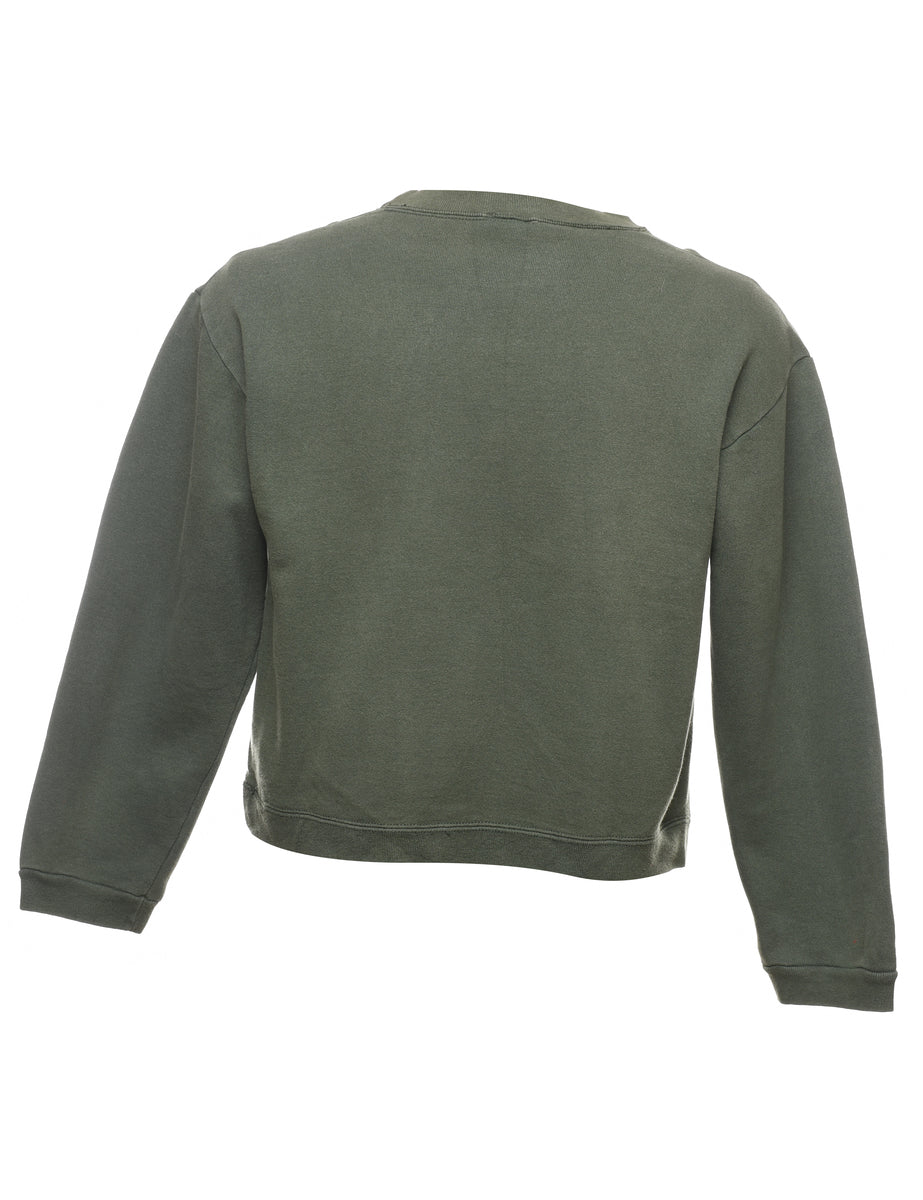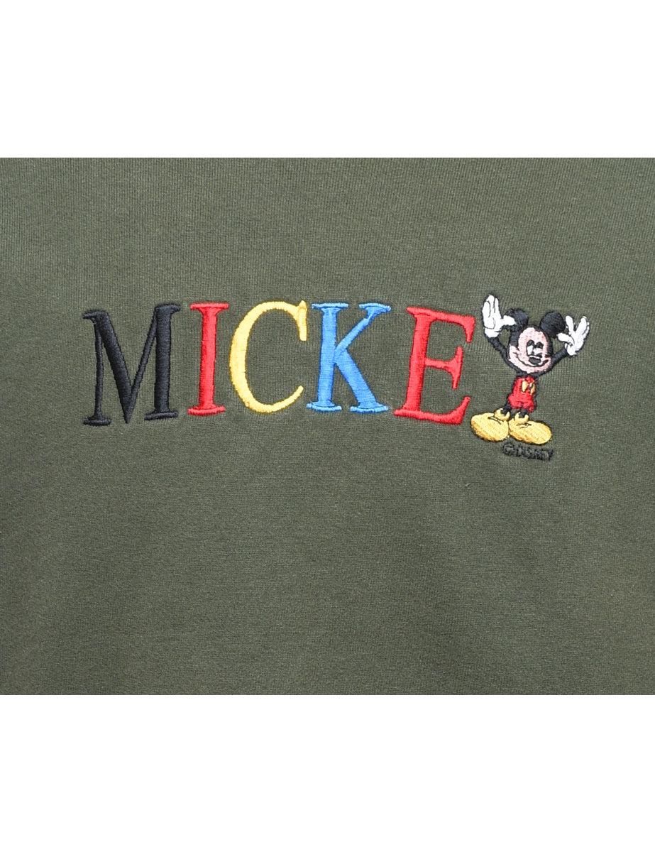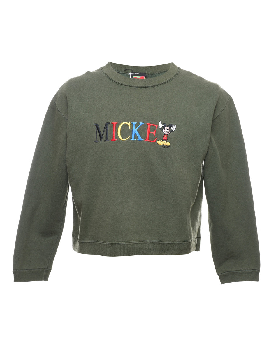 Mickey cropped cartoon sweatshirt. Comes in olive green with embroidery.