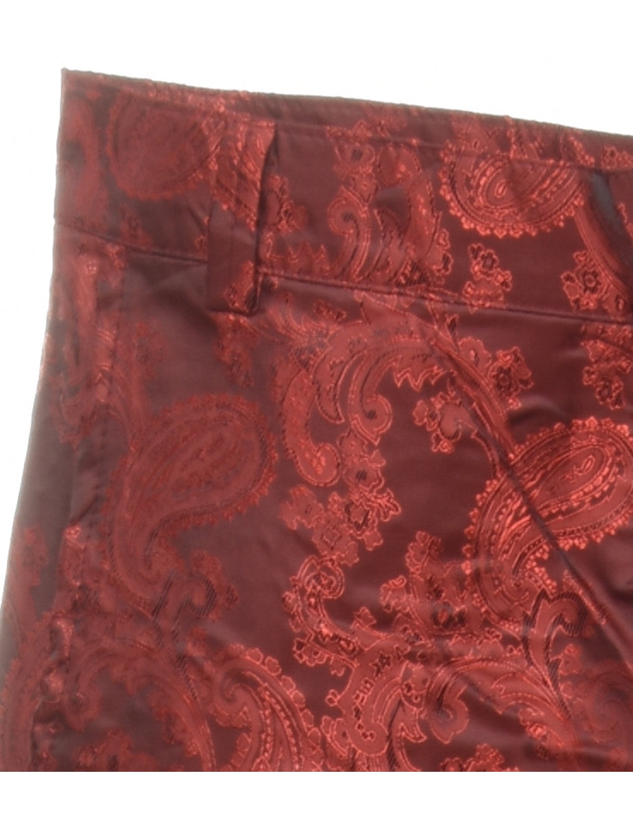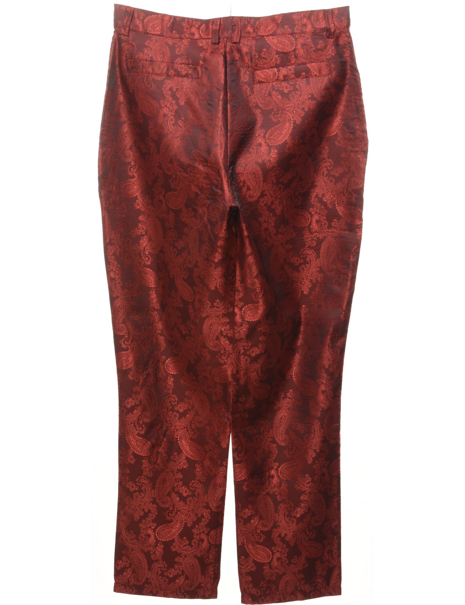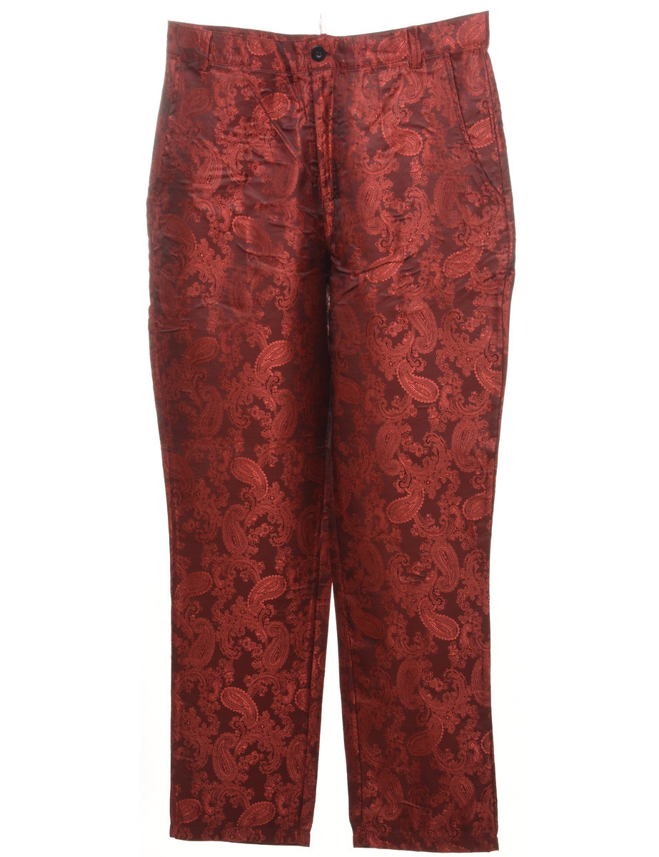 Paisley pattern maroon trousers with belt loops and multiple pockets.
