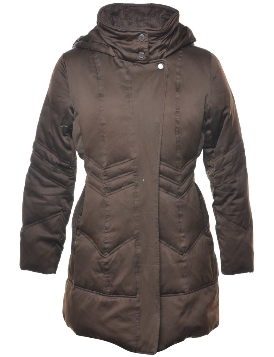 Hooded coat comes in dark brown with full lining and multiple pockets.