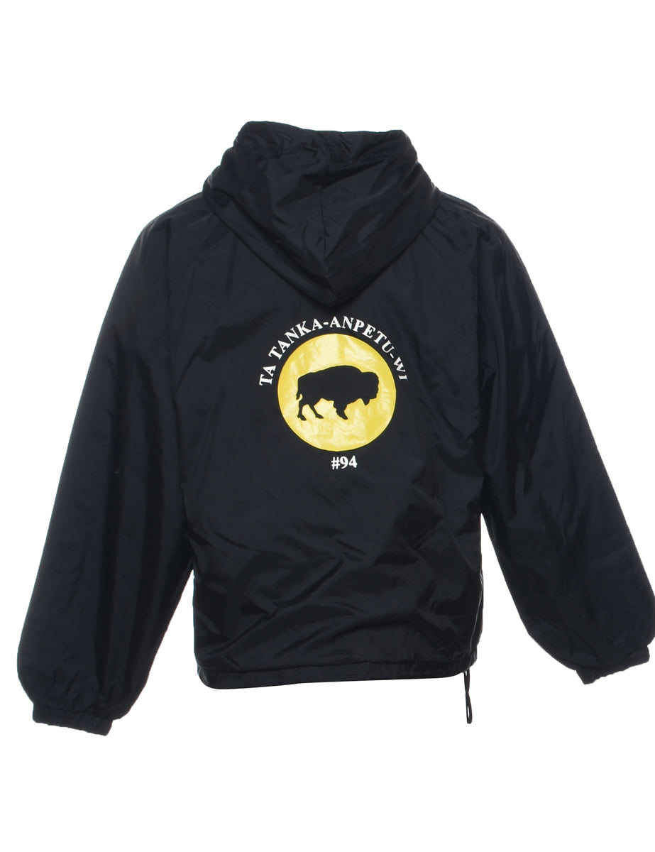 Quarter zip nylon jacket. Comes in black with a hood and raglan sleeves.