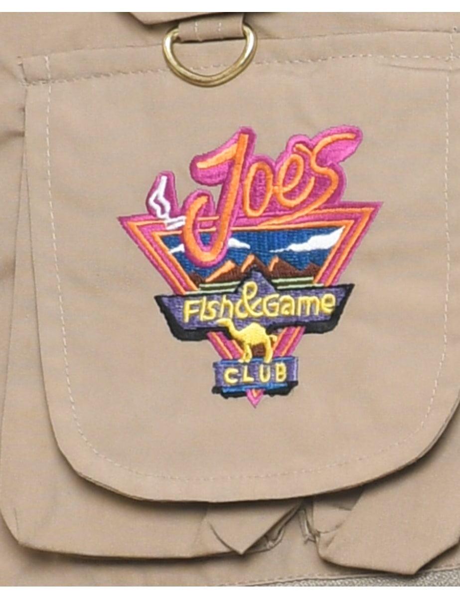 Utilitarian waistcoat comes in beige with multiple pockets.