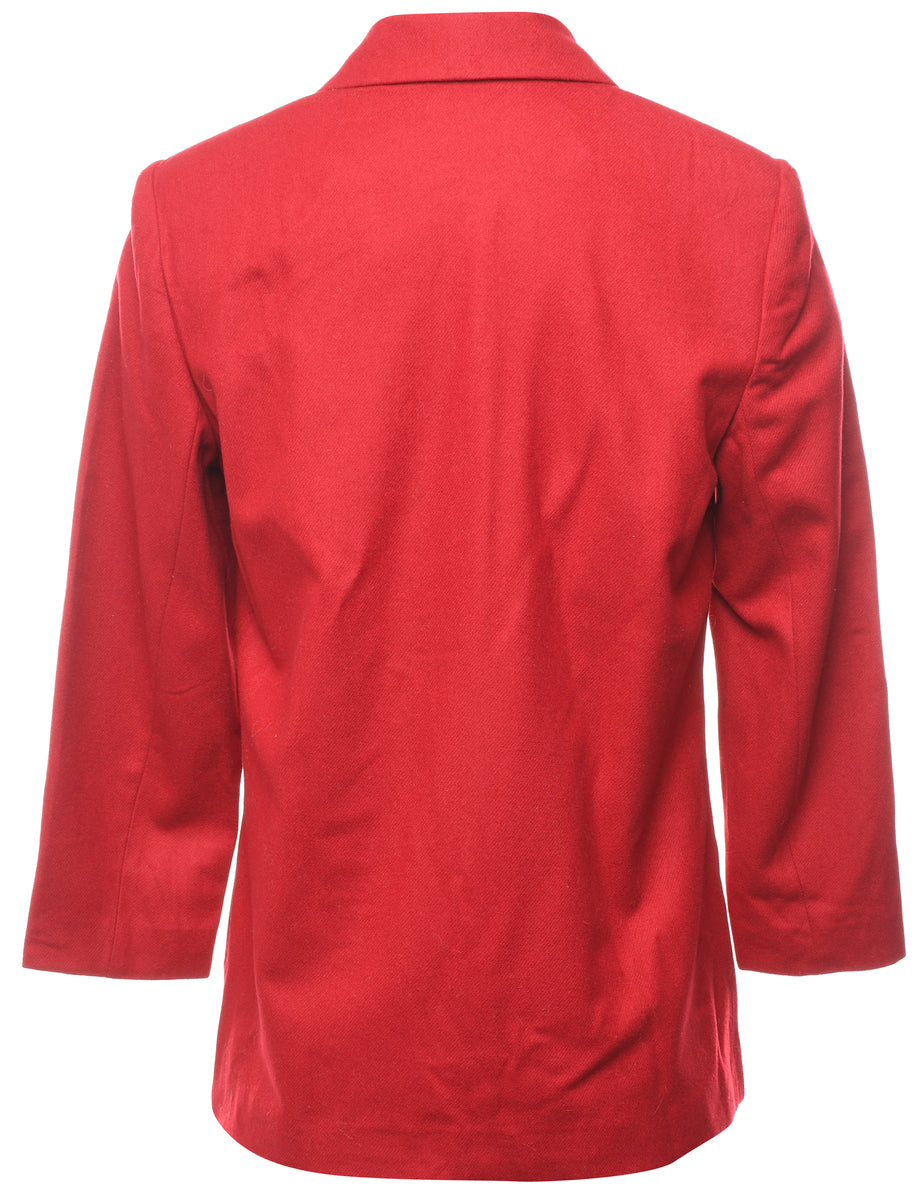 Button front red blazer with multiple pockets and built in shoulder pads.