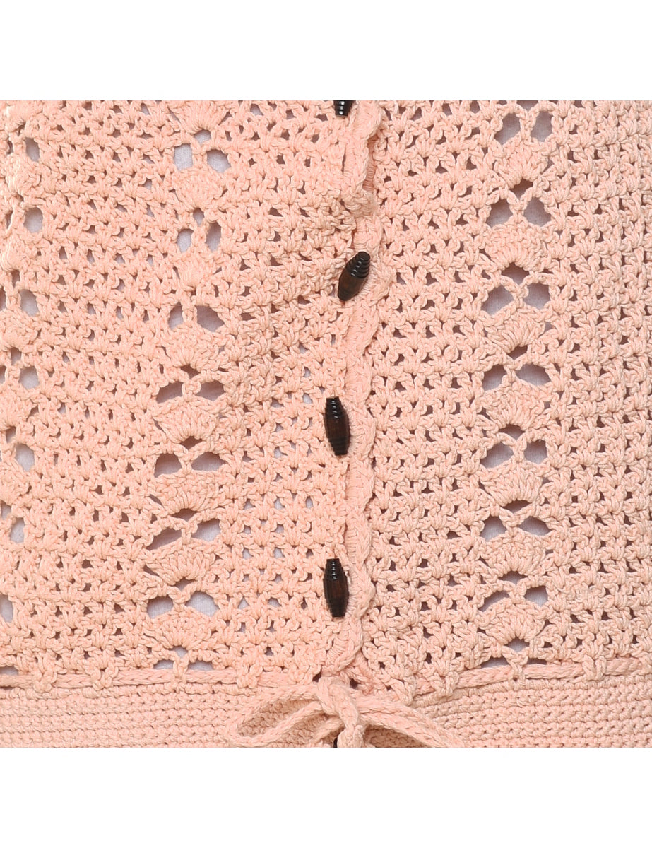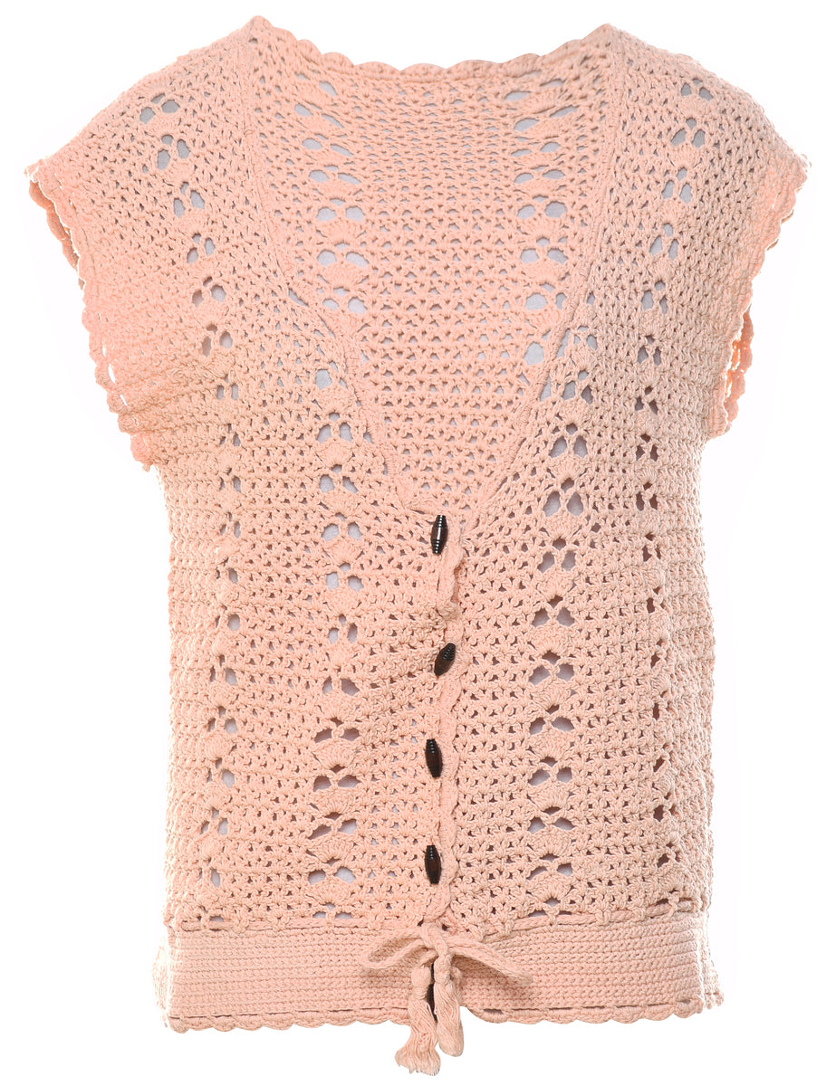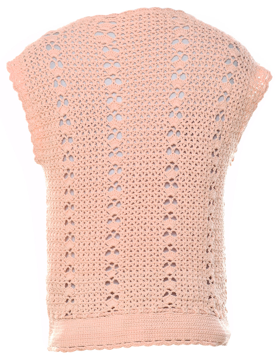 Button through vest with crochet. Comes in pale pink with a scalloped hem.