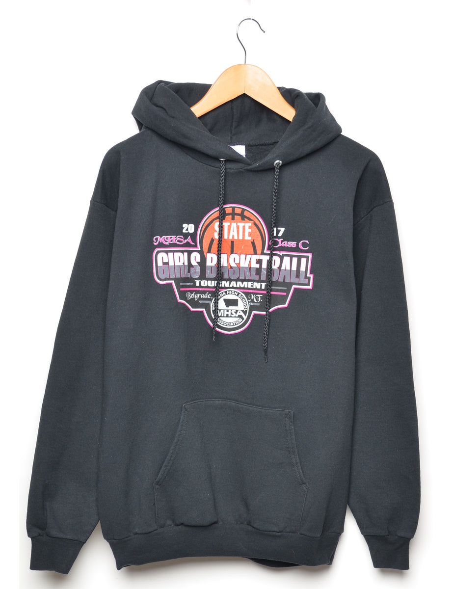 State girls basketball hoodie in black with ribbed cuffs and waistband.