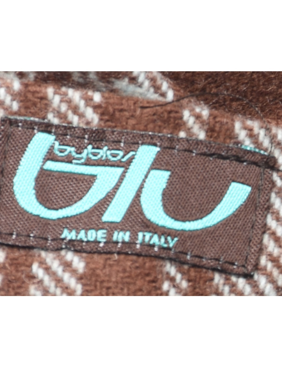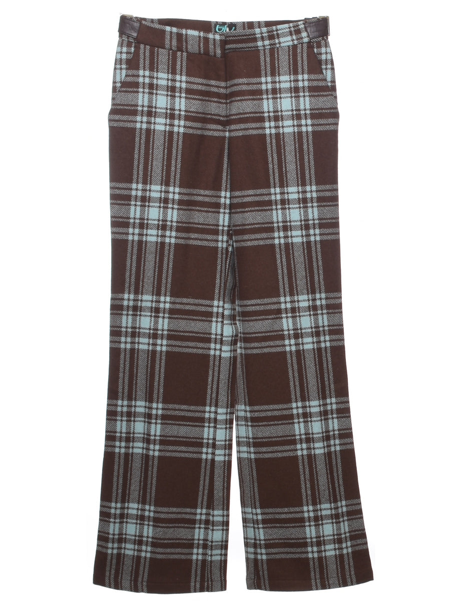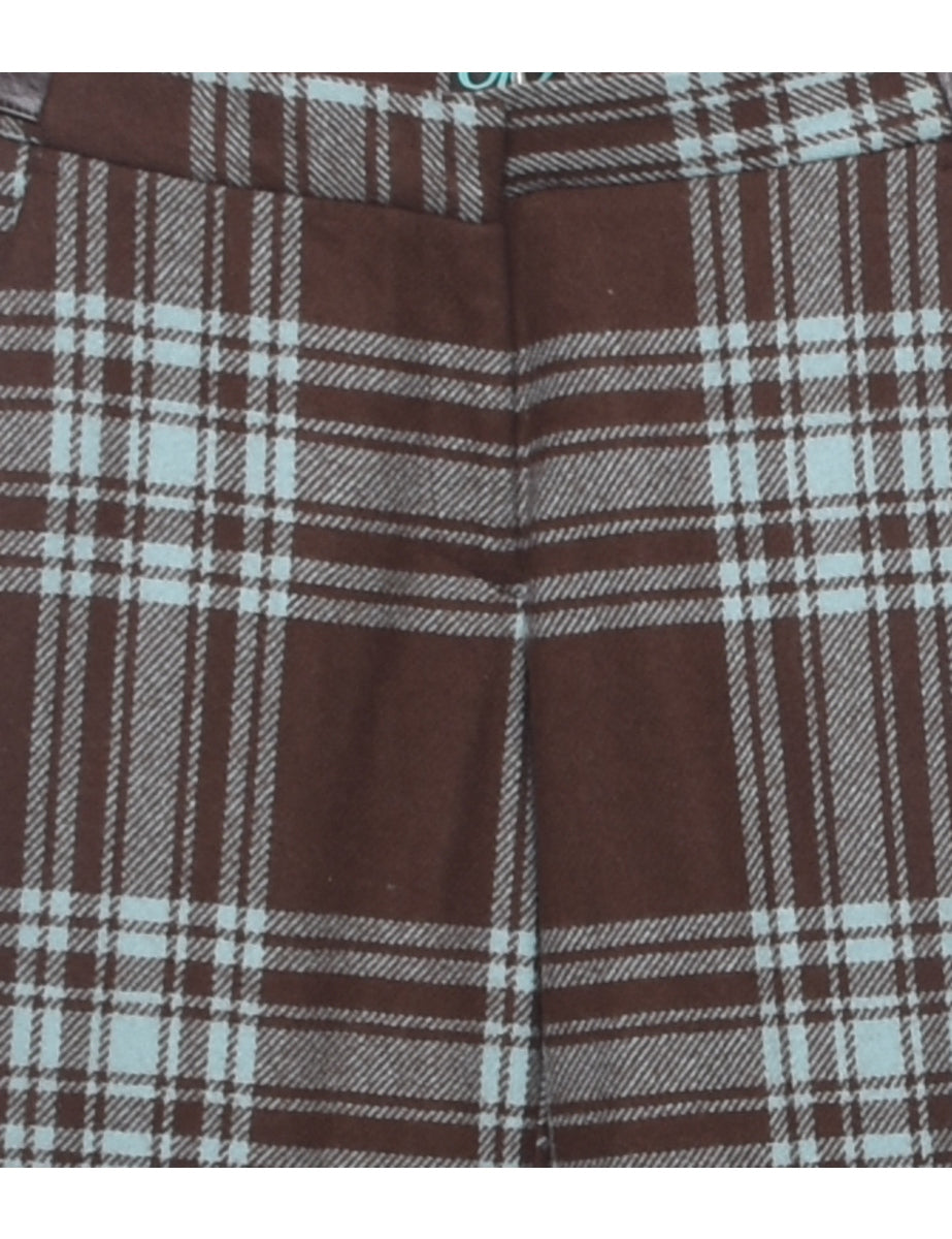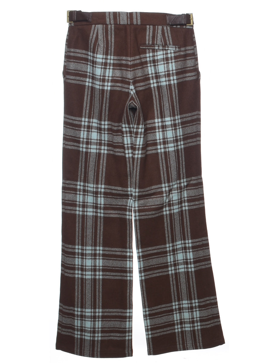 Flared leg trousers with checked pattern comes in brown with multiple pockets and a belt.