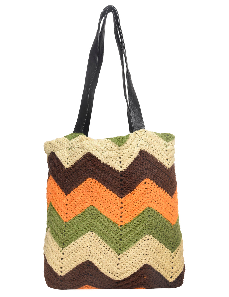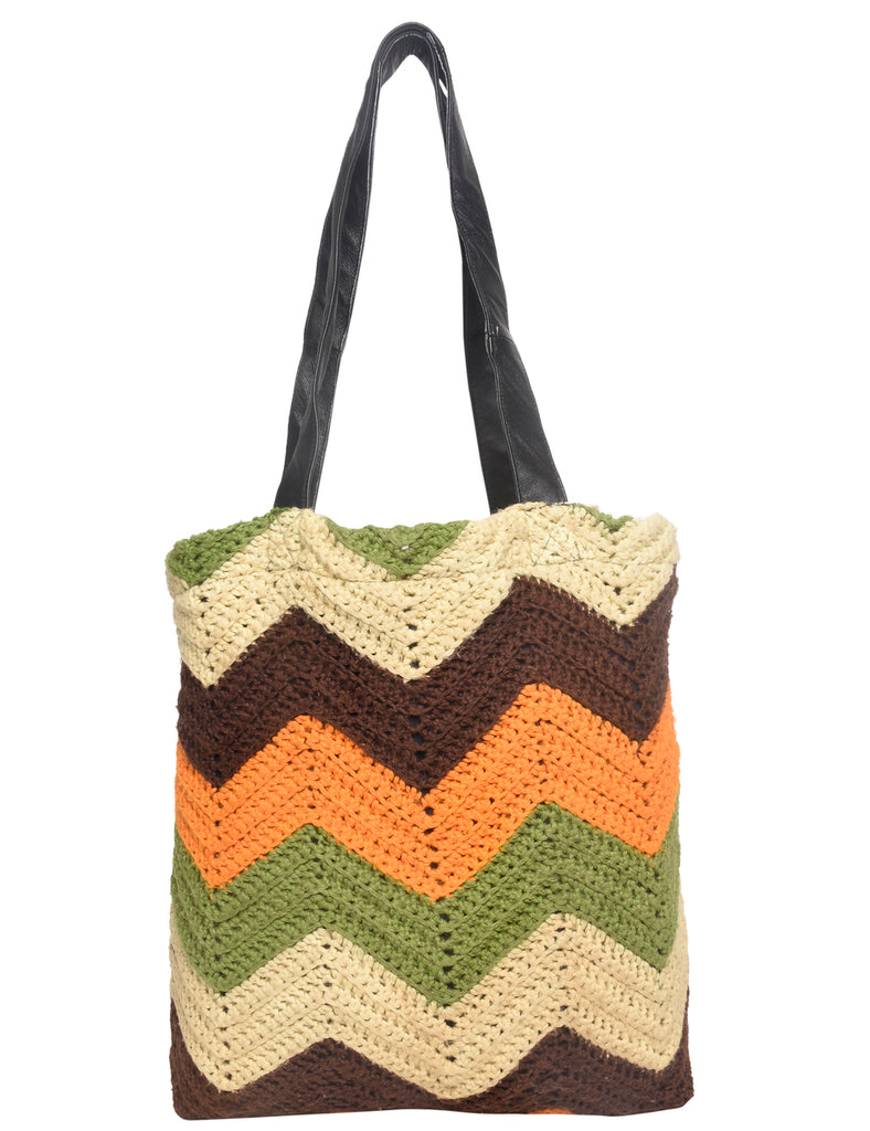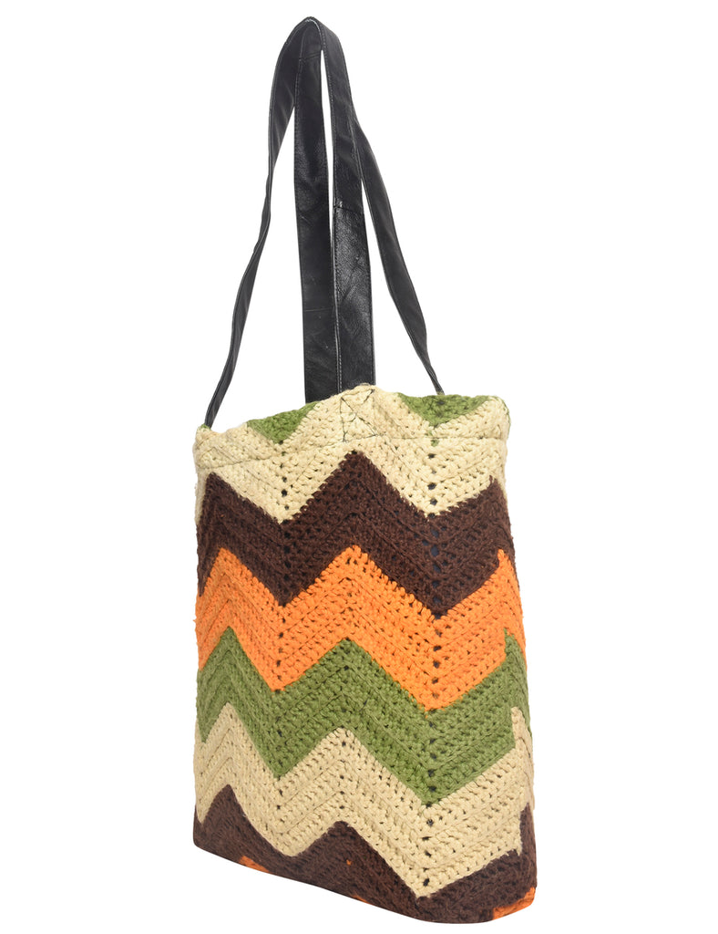 Crochet afghan tote from Beyond Retro Label. Comes in multi-colour with denim lining and a leather handle.