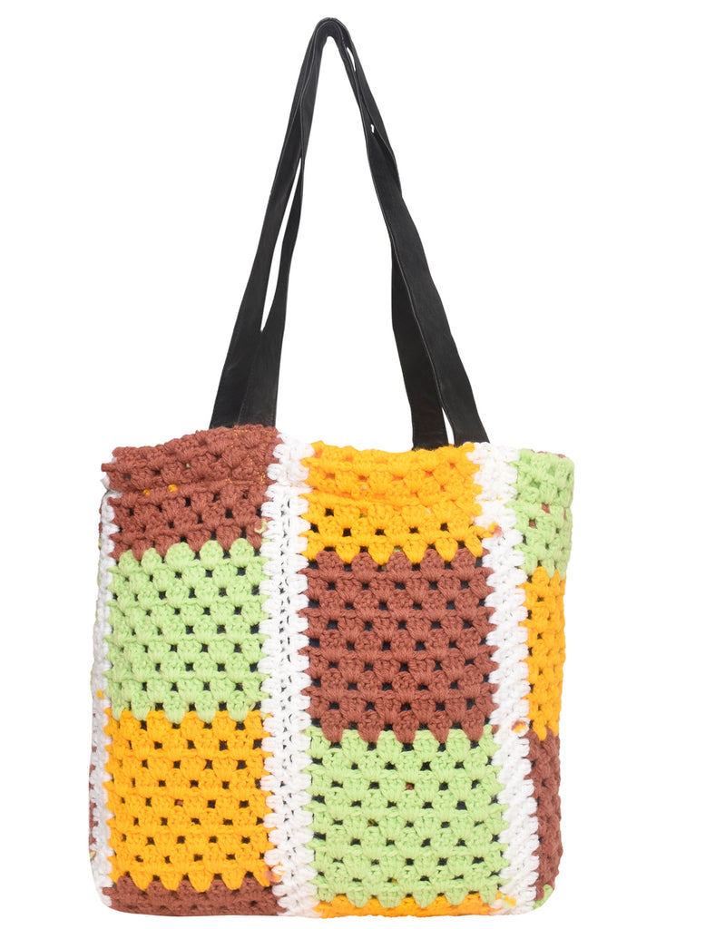 Crochet afghan tote in multi-colour with denim lining and a leather handle. From the brand Beyond Retro Label.