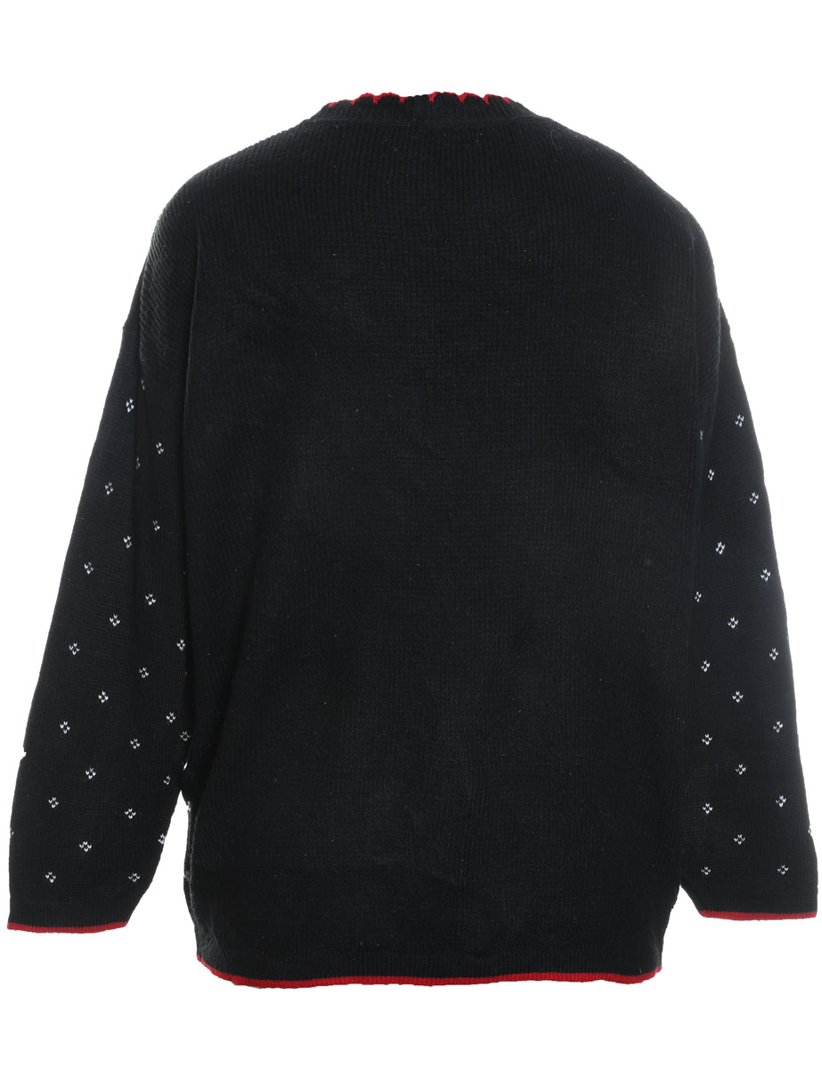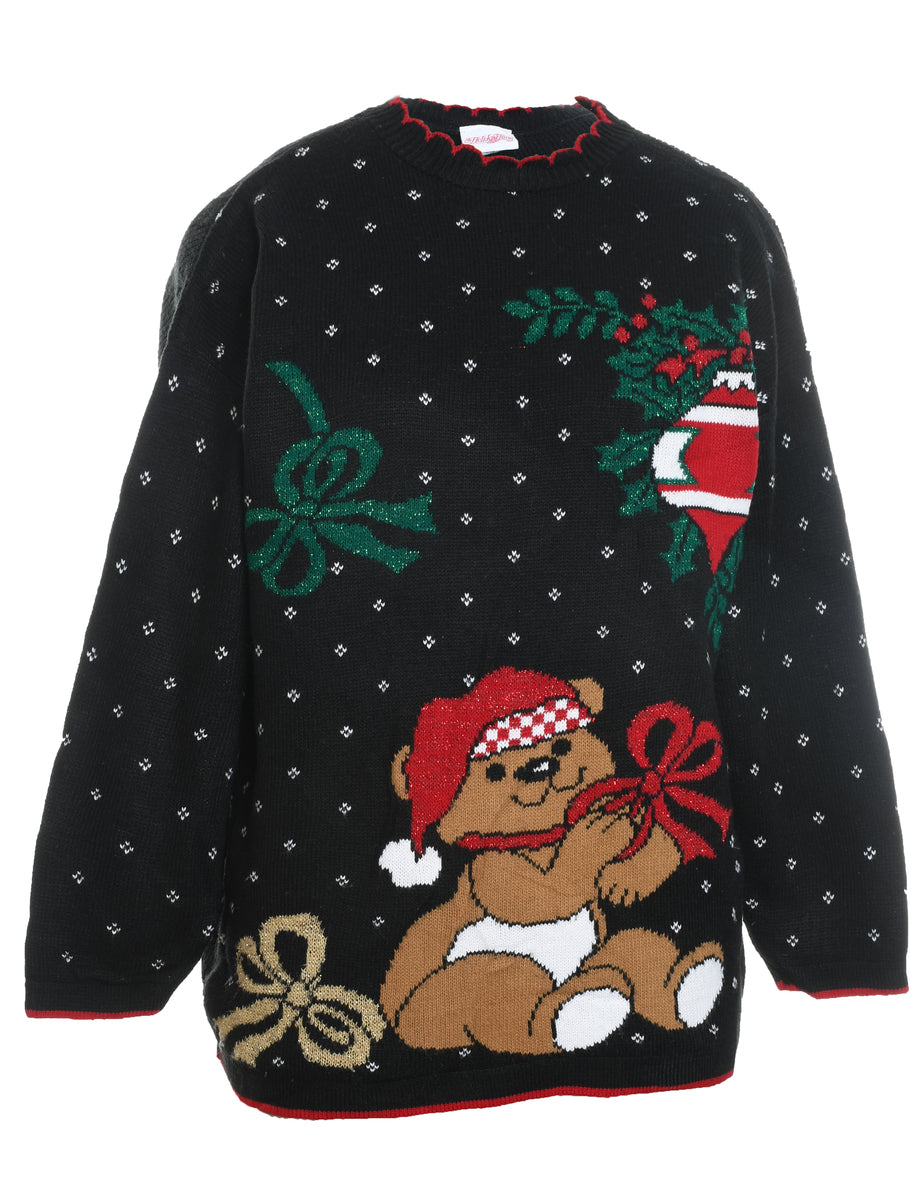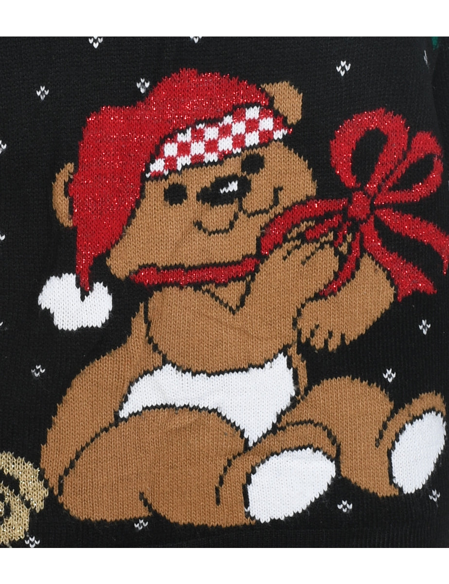 Teddy bear print christmas jumper comes in black with lurex thread pattern and a drop shoulder.