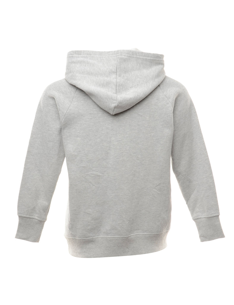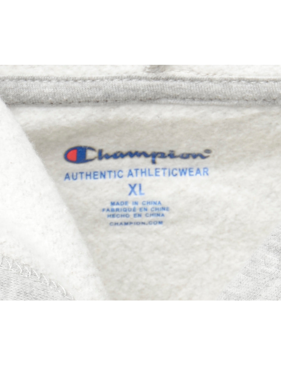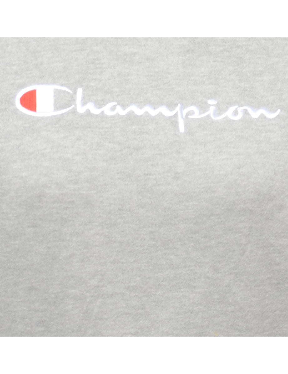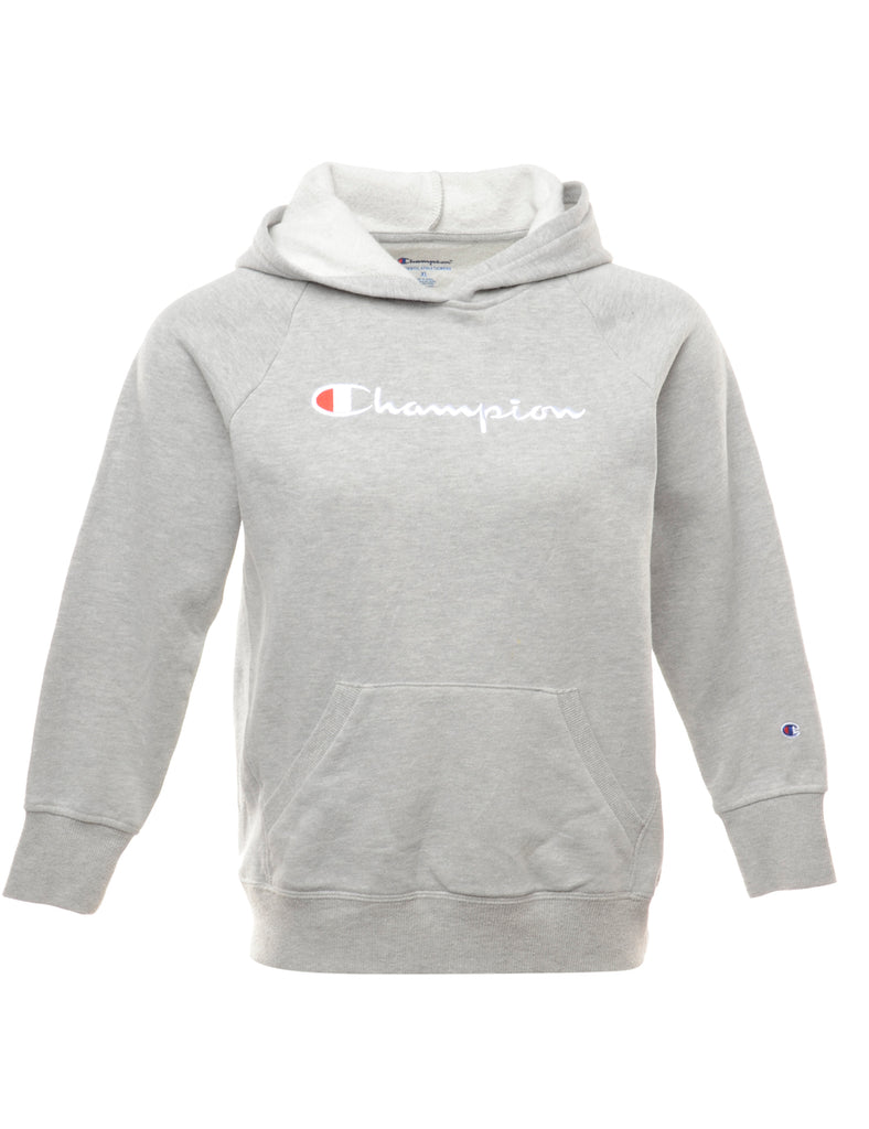 Champion hoodie comes in grey with one pocket and raglan sleeves. The size label mentions XL but based on the actual measurements we consider it a size S.