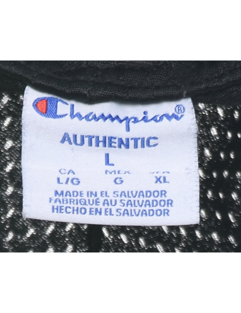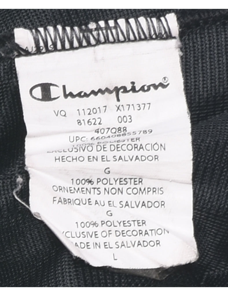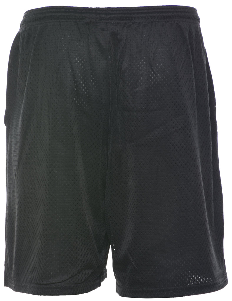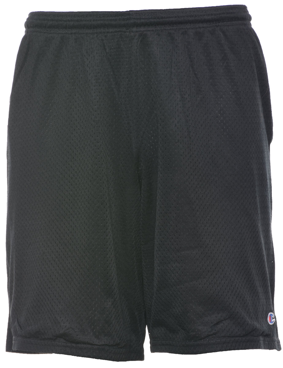 Champion mesh sport shorts in black with multiple pockets and a drawstring waist.