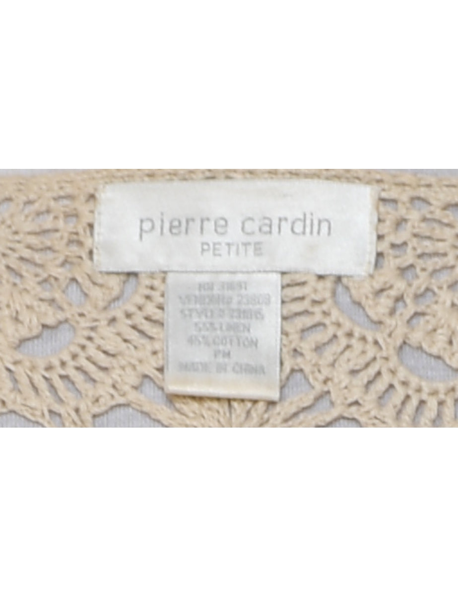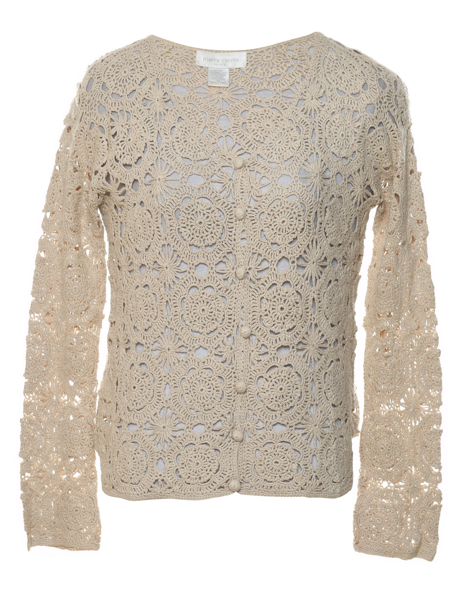 Floral knit cardigan with crochet from Pierre Cardin. Comes in beige.