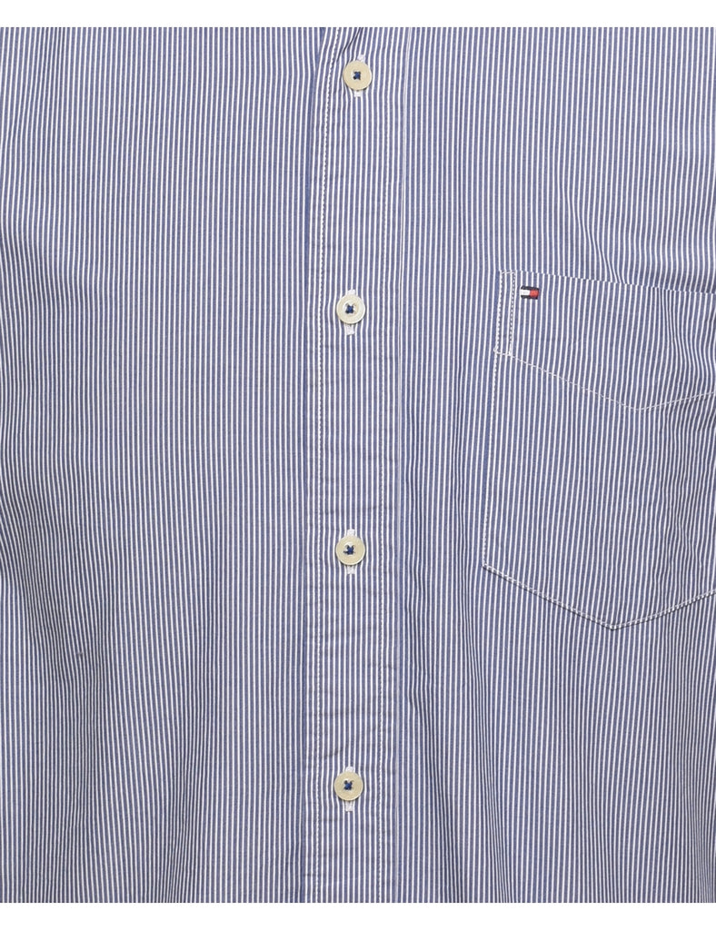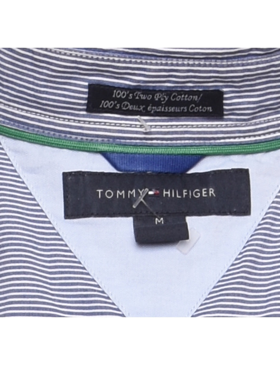 Blue Tommy Hilfiger striped shirt complete with one pocket.