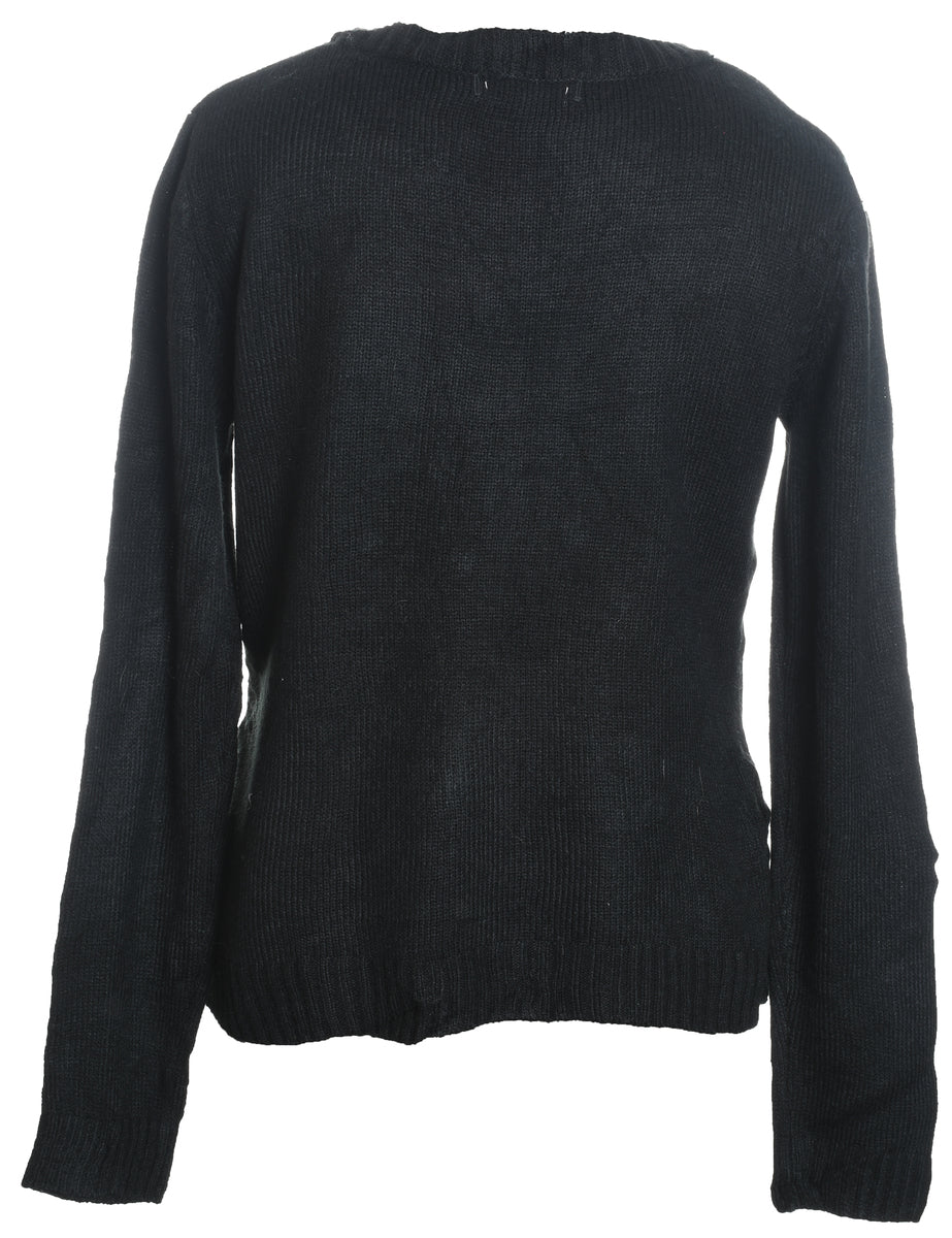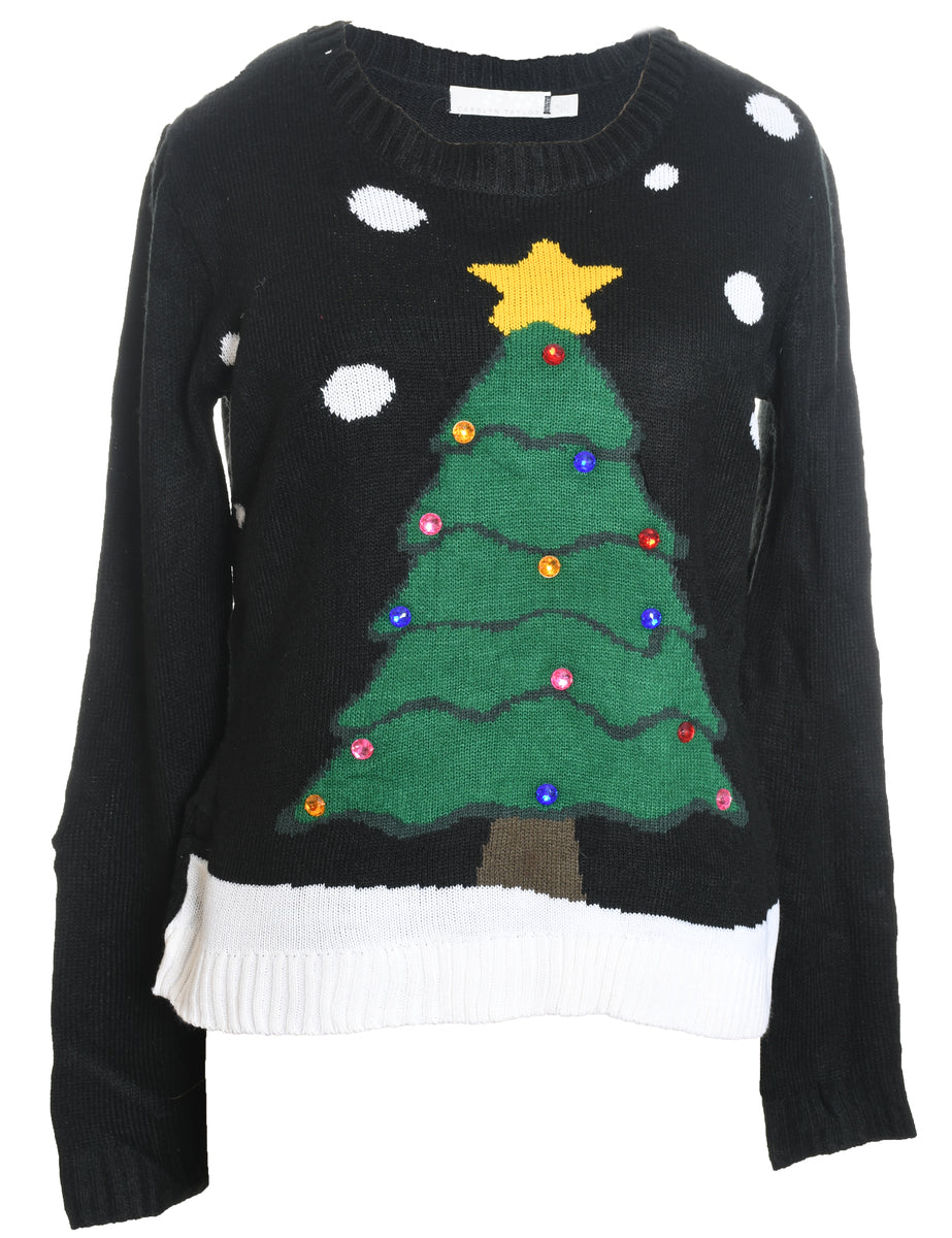 Festive season jumper in black with christmas tree design, a round neck and beading.