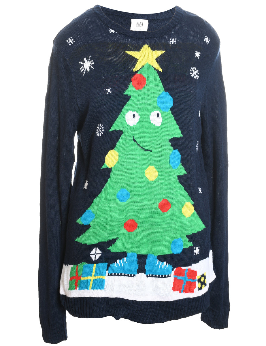 Festive season jumper in navy with christmas tree design, a drop shoulder.